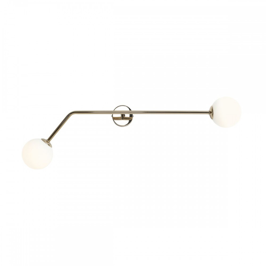 PURE 1064D30 to lampa ścienna z dwoma źródłami światła. Korpus lampy wykonano z wysokiej jakości metalu w kolorze złotym. Klosze są z białego szkła. Kinkiet będzie idealnym wyborem do wnętrz urządzonych w stylu nowoczesnym oraz minimalistycznym. Doskonale będzie się prezentować w: salonie, jadalni, sypialni, pokoju młodzieżowym, lokalu, przedpokoju, korytarzu. Wysokość lampy to: 34 cm, szerokość 97 cm, głębokość 19,5 cm. Źródłem światła jest żarówka typu E14 o mocy max 40W w ilości 2 szt.