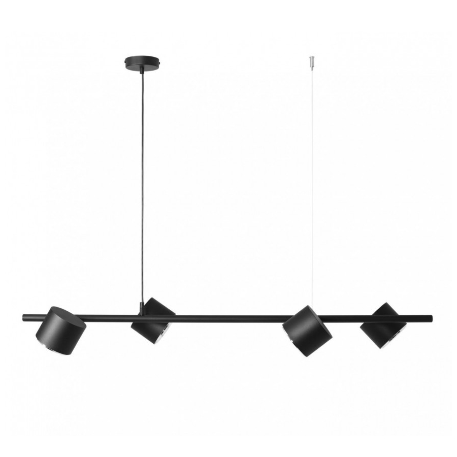 BOT 1047L to lampa wisząca z czterema źródłami światła. Wykonana została z wysokiej jakości metalu w kolorze czarnym. Klosze osadzone są na ruchomych przegubach co pozwala na regulację kąta padania światła. Lampa mocowana jest do sufitu z jednej strony na puszce z przewodem, z drugiej na stalowej lince. Oprawa będzie idealnym wyborem do wnętrz urządzonych w stylu nowoczesnym oraz minimalistycznym. Doskonale będzie się prezentować w: salonie, jadalni, sypialni, pokoju młodzieżowym, lokalu, kuchni, przedpokoju, biurze. Dużą zaletą jest możliwość regulacji wysokości. Wysokość maksymalna lampy to: 100 cm, szerokość 121 cm, głębokość 34 cm. Źródłem światła jest żarówka typu GU10 o mocy max 35W w ilości 4 szt.