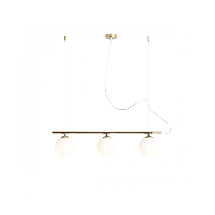 BERYL 3 1006E_30 to lampa wisząca z trzema źródłami światła. Korpus lampy wykonano z wysokiej jakości metalu w kolorze złotym. Klosze są z białego szkła. Oprawa będzie idealnym wyborem do wnętrz urządzonych w stylu nowoczesnym oraz minimalistycznym. Doskonale będzie się prezentować w: salonie, jadalni, sypialni, pokoju młodzieżowym, lokalu, przedpokoju, kuchni. Dużą zaletą jest możliwość regulacji wysokości. Wysokość maksymalna lampy to: 90 cm, szerokość 80 cm, głębokość 14 cm. Źródłem światła jest żarówka typu E14 o mocy max 40W w ilości 3 szt.