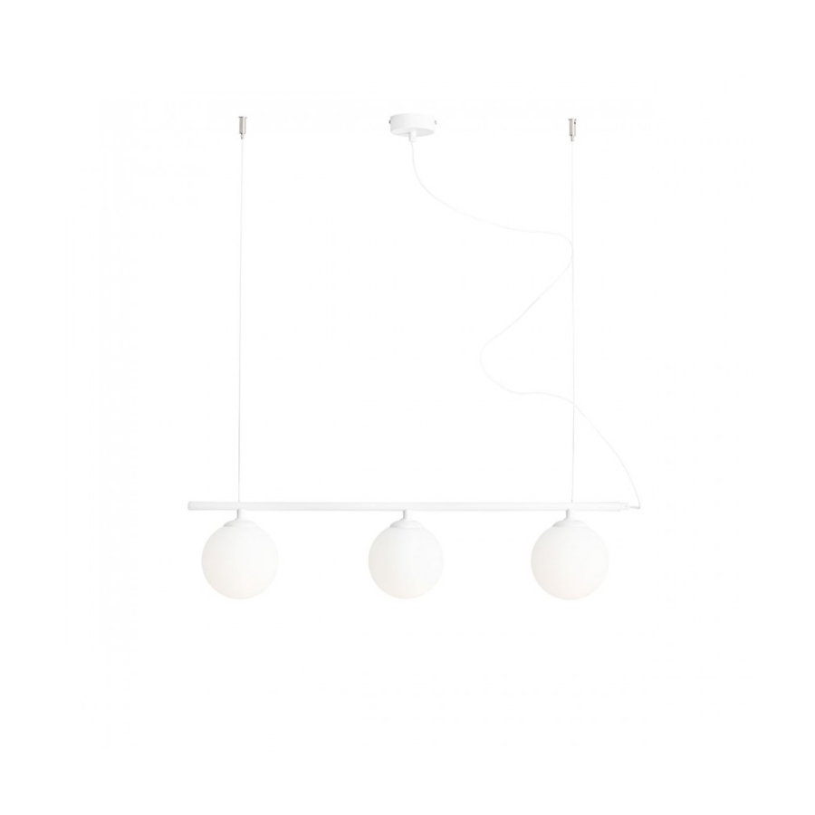BERYL 3 1006E to lampa wisząca z trzema źródłami światła. Korpus lampy wykonano z wysokiej jakości metalu, klosze są szklane. Całość jest w kolorze białym. Oprawa będzie idealnym wyborem do wnętrz urządzonych w stylu nowoczesnym oraz minimalistycznym. Doskonale będzie się prezentować w: salonie, jadalni, sypialni, pokoju młodzieżowym, lokalu, przedpokoju, kuchni. Dużą zaletą jest możliwość regulacji wysokości. Wysokość maksymalna lampy to: 90 cm, szerokość 80 cm, głębokość 14 cm. Źródłem światła jest żarówka typu E14 o mocy max 40W w ilości 3 szt.