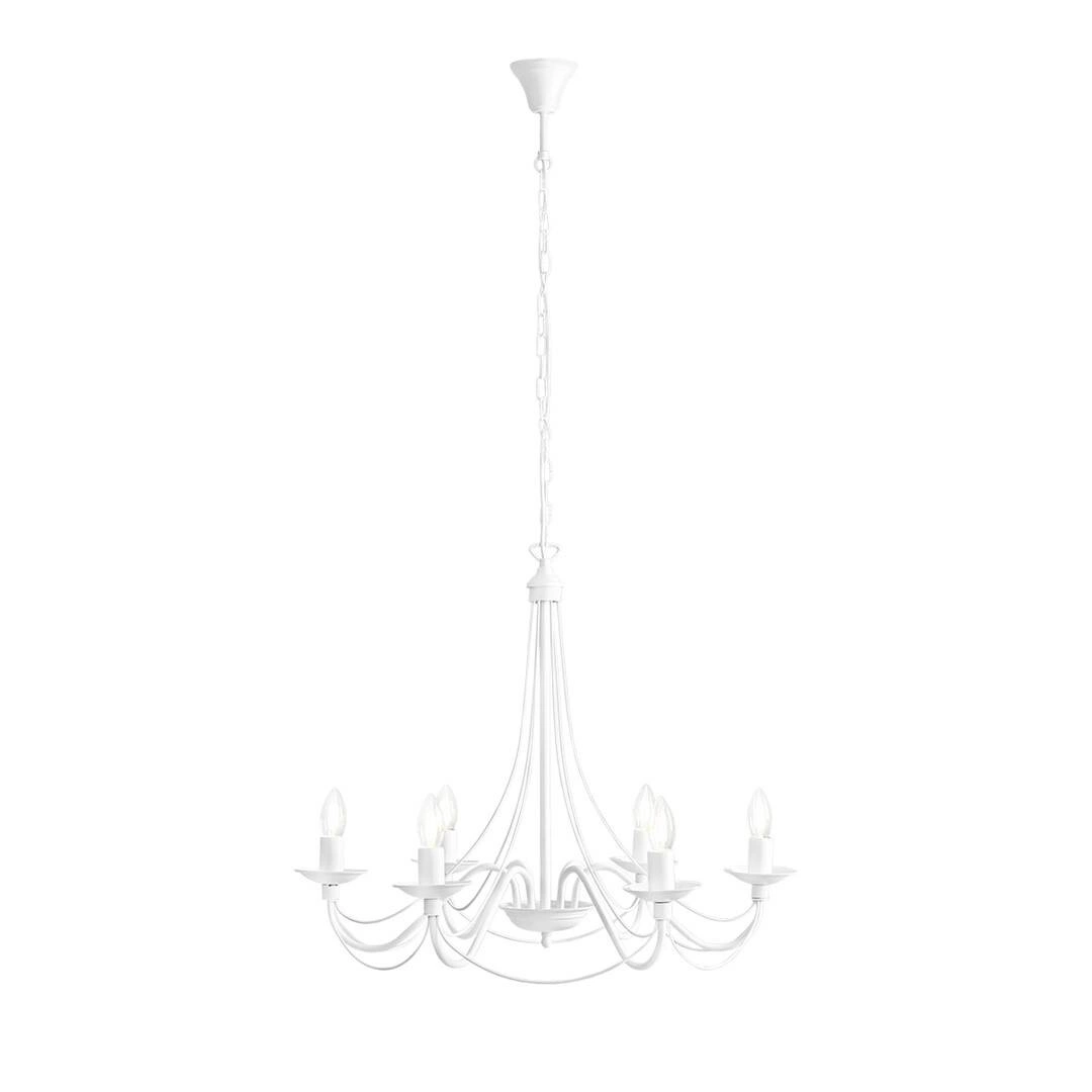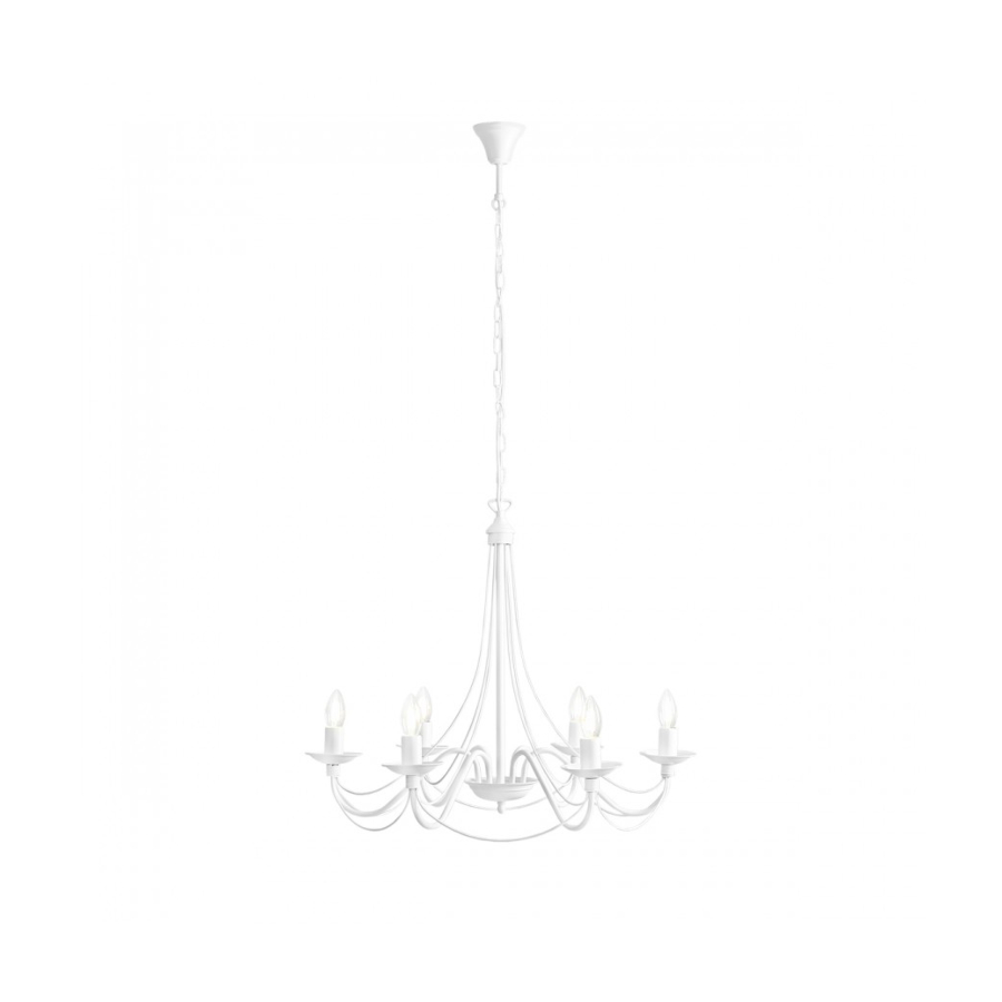 RÓŻA 6 397K to lampa wisząca z sześcioma źródłami światła. Wykonana została z wysokiej jakości metalu w kolorze białym. Lampa nie posiada kloszy co sprawia, że odsłonięte żarówki są elementami ozdobnymi dlatego warto wybrać ich dekoracyjny model (najkorzystniej prezentuje się z żarówkami w kształcie świeczki). Lampa będzie idealnym wyborem do wnętrz urządzonych w klasycznym stylu. Doskonale będzie się prezentować w: salonie, jadalni, sypialni, gabinecie, lokalu, salach weselnych, bankietowych. Dużą zaletą jest możliwość regulacji wysokości. Wysokość maksymalna lampy to: 108 cm, szerokość 65 cm, głębokość 65 cm. Źródłem światła jest żarówka typu E14 o mocy max 40W w ilości 6 szt.