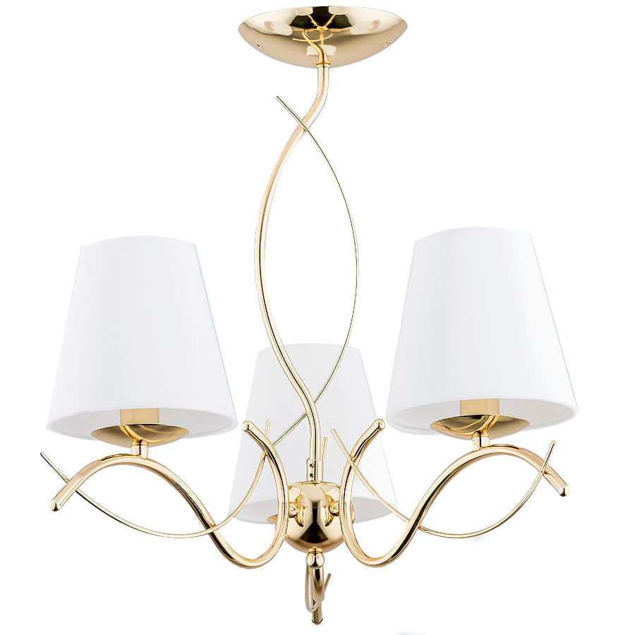 Wykonana z metalu pokrytego na złoty kolor oraz klasycznych białych abażurów.