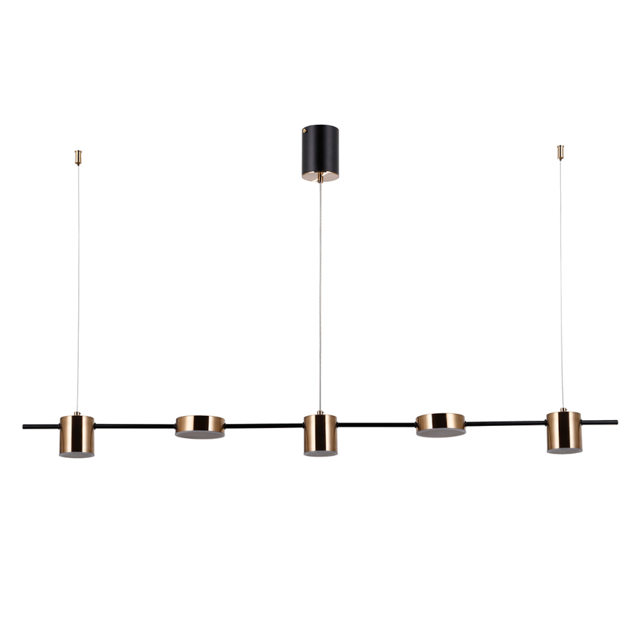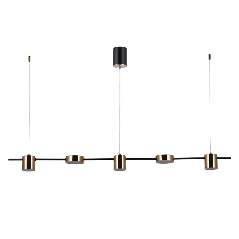 REMDAL PND-16374-5-BK-3K to lampa wisząca z pięcioma źródłami światła. Wykonana została z wysokiej jakości aluminium oraz stali w kolorze mosiężnym z czarnymi detalami. Źródła światła ukryte są pod białymi osłonami z tworzywa. Oprawa będzie idealnym wyborem do wnętrz urządzonych w stylu nowoczesnym oraz modernistycznym. Doskonale będzie się prezentować w: salonie, jadalni, sypialni, pokoju młodzieżowym, gabinecie, lokalu, kuchni. Dużym atutem jest możliwość regulacji wysokości. Wysokość maksymalna lampy to 120 cm, szerokość 10 cm, długość 130 cm. W lampie zastosowano zintegrowane źródła światła LED o łącznej mocy 30W, ciepłej barwie 3000K i jasności 2300lm