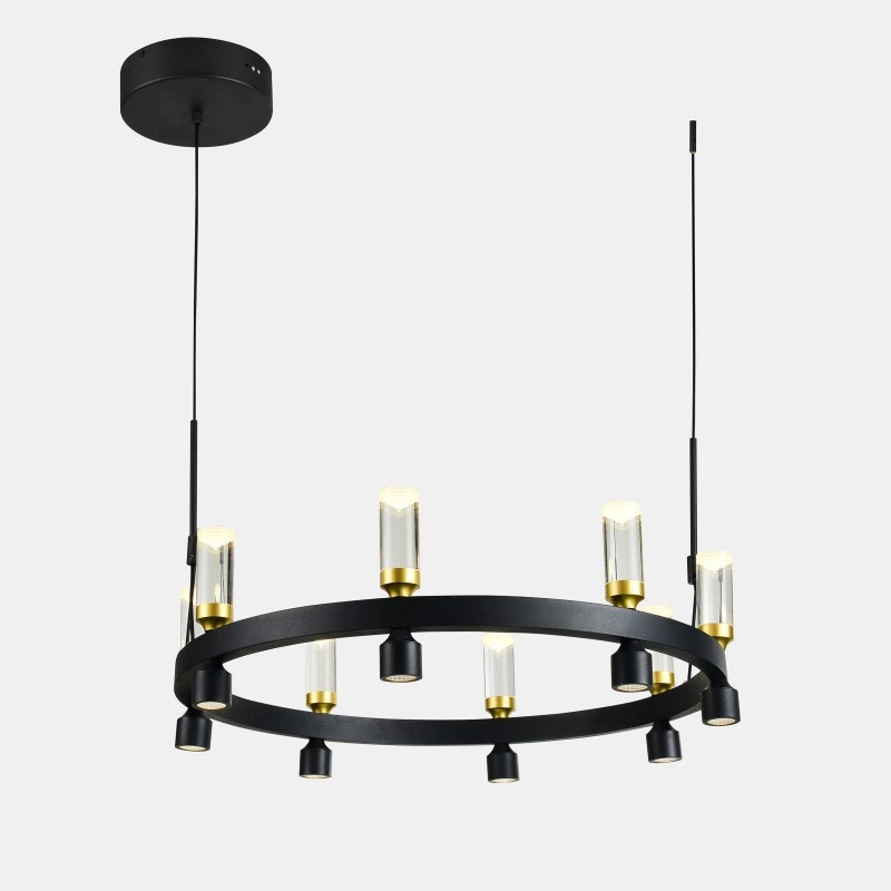 ALMELO PND-83812-16 to lampa wisząca z szesnastoma punktami światła. Wykonana została z wysokiej jakości stali i aluminium w kolorze czarnym ze złotymi i transparentnymi detalami. Oprawa będzie idealnym wyborem do wnętrz urządzonych w stylu nowoczesnym, industrialnym oraz loftowym. Doskonale będzie się prezentować w: salonie, jadalni, sypialni, pokoju młodzieżowym, gabinecie, lokalu, kuchni. Dużą zaletą jest możliwość regulacji wysokości. Wysokość maksymalna lampy to 170 cm, szerokość 61,8 cm, długość 61,8 cm. W lampie zastosowano zintegrowane źródła światła LED o łącznej mocy 38,8W, ciepłej barwie 3000K i jasności 2462lm