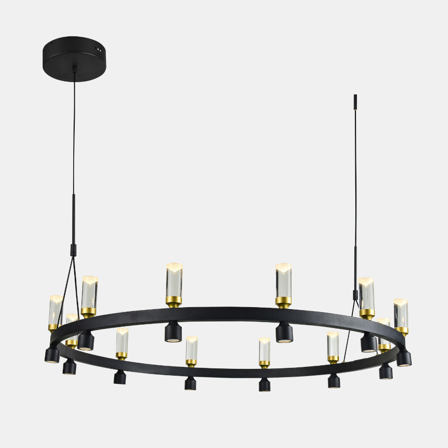 ALMELO PND-83812-24 to lampa wisząca z dwudziestoma czterema punktami światła. Wykonana została z wysokiej jakości stali i aluminium w kolorze czarnym ze złotymi i transparentnymi detalami. Oprawa będzie idealnym wyborem do wnętrz urządzonych w stylu nowoczesnym, industrialnym oraz loftowym. Doskonale będzie się prezentować w: salonie, jadalni, sypialni, pokoju młodzieżowym, gabinecie, lokalu, kuchni. Dużą zaletą jest możliwość regulacji wysokości. Wysokość maksymalna lampy to 170 cm, szerokość 101,8 cm, długość 101,8 cm. W lampie zastosowano zintegrowane źródła światła LED o łącznej mocy 50,4W, ciepłej barwie 3000K i jasności 3103lm