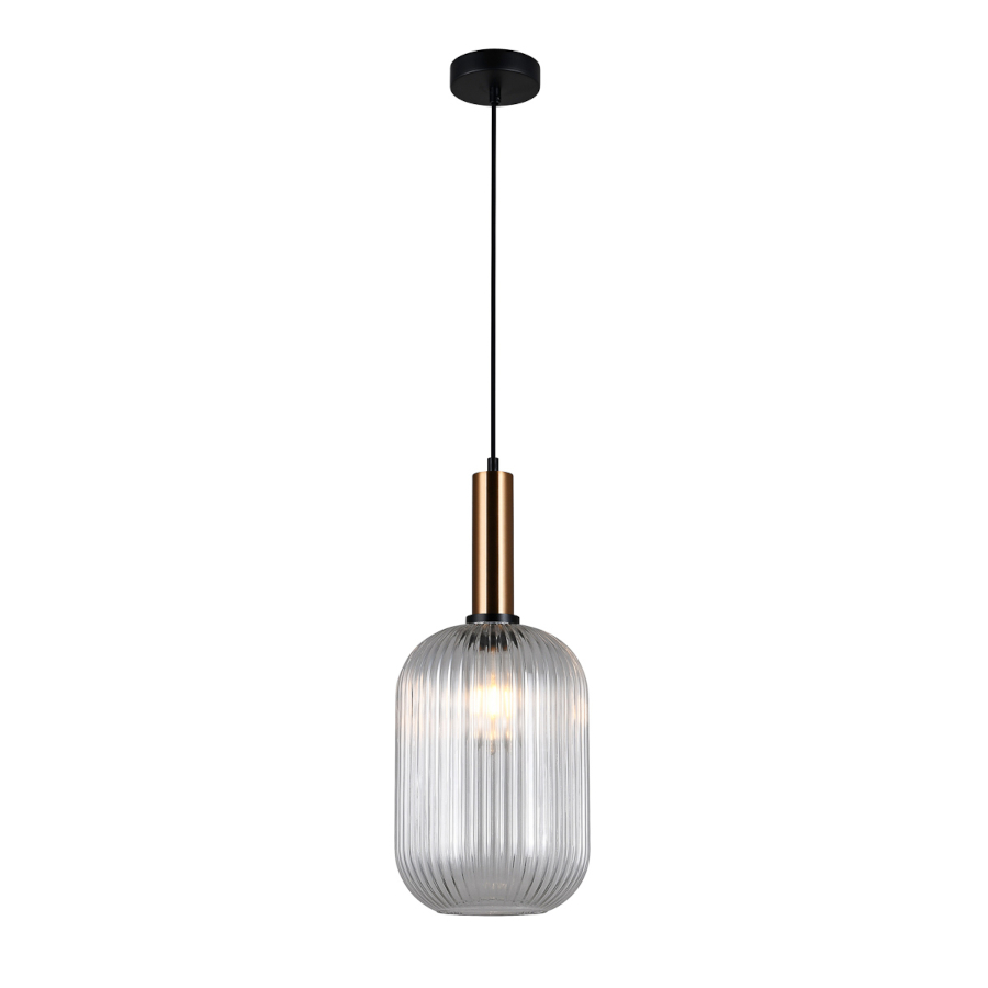 ANTIOLA PND-5588-1L-BRO+CL to lampa wisząca z jednym źródłem światła. Zawiesie lampy wykonano z wysokiej jakości stali. Klosz jest z transparentnego szkła o ciekawej żebrowanej fakturze zwieńczony nadkloszówką w kolorze mosiężnym. Oprawa będzie idealnym wyborem do wnętrz urządzonych w stylu nowoczesnym, minimalistycznym, industrialnym oraz loftowym. Doskonale będzie się prezentować w: salonie, jadalni, sypialni, pokoju młodzieżowym, gabinecie, lokalu, biurze. Dużym atutem jest możliwość regulacji wysokości. Wysokość maksymalna lampy to: 125 cm, średnica 20 cm. Źródłem światła jest żarówka typu E27 o mocy max 40W w ilości 1 szt.