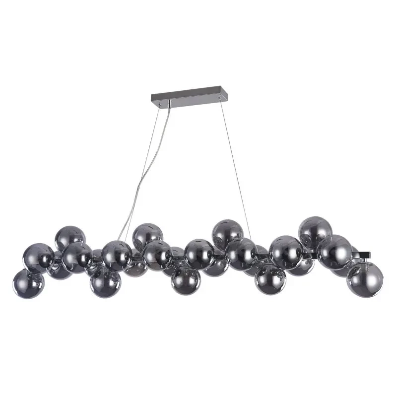 CABELLA PND-5252-A-25-CH+SMK to lampa wisząca z dwudziestoma pięcioma źródłami światła. Korpus lampy wykonano z wysokiej jakości stali w kolorze chromowym. Kuliste klosze są z dymionego szkła. Oprawa będzie idealnym wyborem do wnętrz urządzonych w nowoczesnym stylu. Doskonale będzie się prezentować w: salonie, jadalni, sypialni, pokoju młodzieżowym, gabinecie, lokalu, kuchni. Dużą zaletą jest możliwość regulacji wysokości. Wysokość maksymalna lampy to 120 cm, szerokość 24 cm, długość 125 cm. Źródłem światła jest żarówka typu G9 o mocy max 28W w ilości 25 szt.
