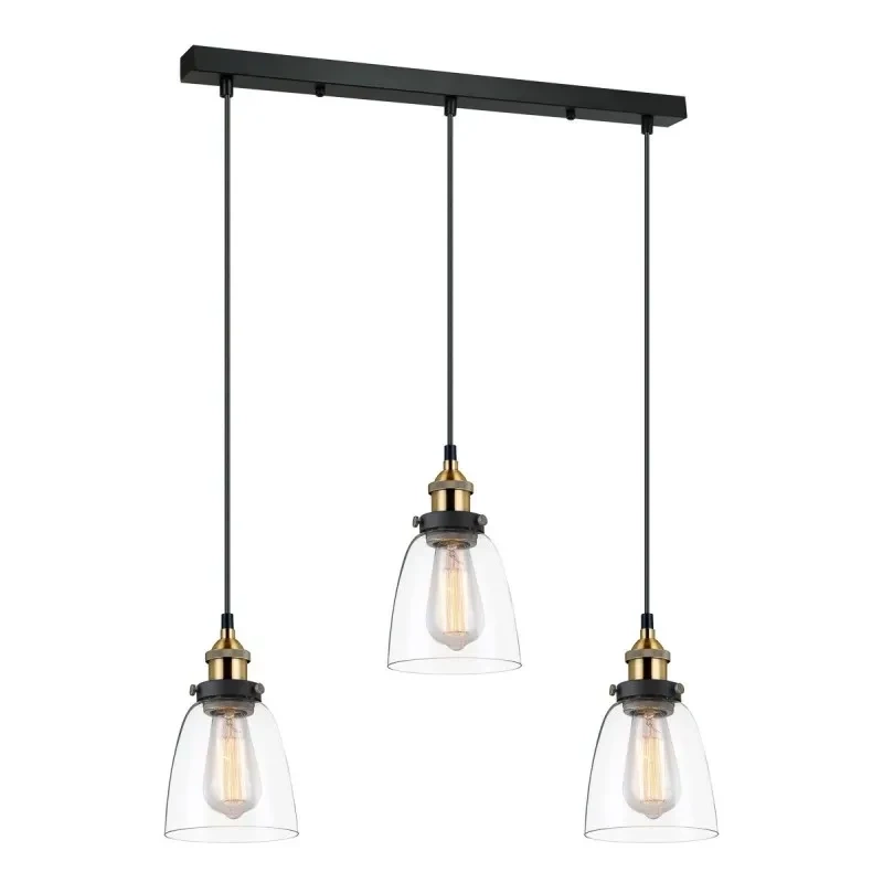 FRANCIS MDM-2563/3 GD+CL to lampa wisząca z trzema źródłami światła. Zawiesie lampy wykonano z wysokiej jakości stali w kolorze czarnym z ozdobnymi oprawkami żarówek koloru złotego. Klosze są z przeźroczystego szkła, co sprawia, że widoczne żarówki mogą być elementami ozdobnymi dlatego warto wybrać ich dekoracyjny model. Oprawa będzie idealnym wyborem do wnętrz urządzonych w stylu industrialnym, loftowym oraz retro. Doskonale będzie się prezentować w: salonie, jadalni, sypialni, pokoju młodzieżowym, gabinecie, lokalu, biurze, przedpokoju, kuchni. Dużym atutem jest możliwość regulacji wysokości. Wysokość maksymalna lampy to: 96,5 cm, szerokość 14,5 cm, długość 64,5 cm. Źródłem światła jest żarówka typu E27 o mocy max 40W w ilości 3 szt.