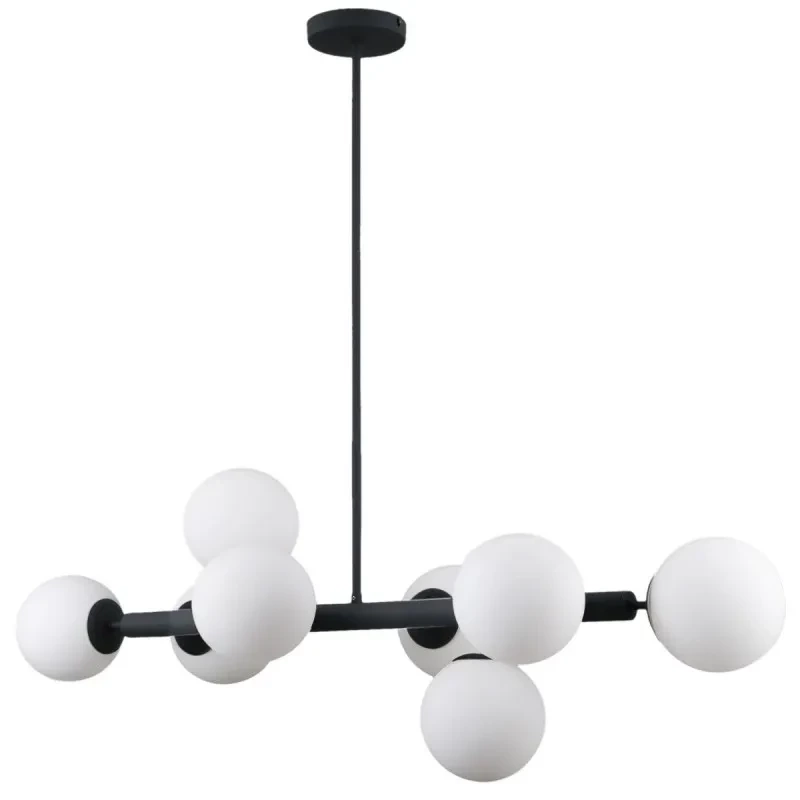 RADDI PNS-5510-8-BK to nowoczesna lampa wisząca z ośmioma źródłami światła. Korpus lampy wykonano z wysokiej jakości stali w kolorze grafitowym. Kuliste klosze są z białego szkła. Oprawa będzie idealnym wyborem do wnętrz urządzonych w nowoczesnym stylu. Doskonale będzie się prezentować w: salonie, jadalni, sypialni, pokoju młodzieżowym, lokalu, kuchni. Wysokość lampy to: 90 cm, szerokość 40 cm, długość 105 cm. Źródłem światła jest żarówka typu G9 o mocy max 5W w ilości 8 szt.