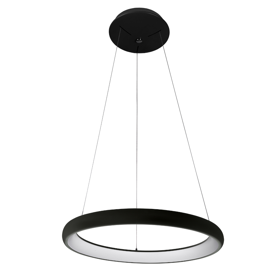 ALESSIA 5280-840RP-BK-3 to lampa wisząca ze zintegrowanym źródłem światła LED. Zawiesie wykonano z wysokiej jakości metalu w kolorze czarnym. Klosz lampy składa się z czarnego okręgu wewnątrz którego pod akrylową osłoną znajduje się źródło światła. Oprawa będzie idealnym wyborem do wnętrz urządzonych w nowoczesnym stylu. Doskonale będzie się prezentować w: salonie, jadalni, sypialni, pokoju młodzieżowym, gabinecie, lokalu, kuchni. Dużą zaletą jest możliwość regulacji wysokości. Wysokość maksymalna lampy to 120 cm, średnica 51 cm. W lampie zastosowano zintegrowane źródło światła LED o mocy 40W, ciepłej barwie 3000K i jasności 2200lm