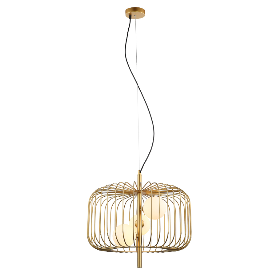 DAREN MDM-3936/3 GD to lampa wisząca z trzema źródłami światła. Zawiesie lampy wykonano z wysokiej jakości stali w kolorze złotym. Lampa posiada duży złoty druciany klosz wewnątrz którego osadzono trzy kuliste klosze z mlecznego szkła. Oprawa będzie idealnym wyborem do wnętrz urządzonych w stylu nowoczesnym, industrialnym oraz loftowym. Doskonale będzie się prezentować w: salonie, jadalni, sypialni, pokoju młodzieżowym, gabinecie, lokalu, przedpokoju, kuchni. Dużym atutem jest możliwość regulacji wysokości. Wysokość maksymalna lampy to: 113 cm, średnica 45 cm. Źródłem światła jest żarówka typu G9 o mocy max 25W w ilości 3 szt.