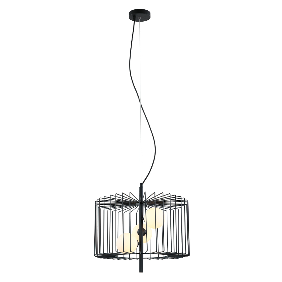 DAREN MDM-3937/3 BK to lampa wisząca z trzema źródłami światła. Zawiesie lampy wykonano z wysokiej jakości stali w kolorze czarnym. Lampa posiada duży czarny druciany klosz wewnątrz którego osadzono trzy kuliste klosze z mlecznego szkła. Oprawa będzie idealnym wyborem do wnętrz urządzonych w stylu nowoczesnym, industrialnym oraz loftowym. Doskonale będzie się prezentować w: salonie, jadalni, sypialni, pokoju młodzieżowym, gabinecie, lokalu, przedpokoju, kuchni. Dużym atutem jest możliwość regulacji wysokości. Wysokość maksymalna lampy to: 113 cm, średnica 45 cm. Źródłem światła jest żarówka typu G9 o mocy max 25W w ilości 3 szt.