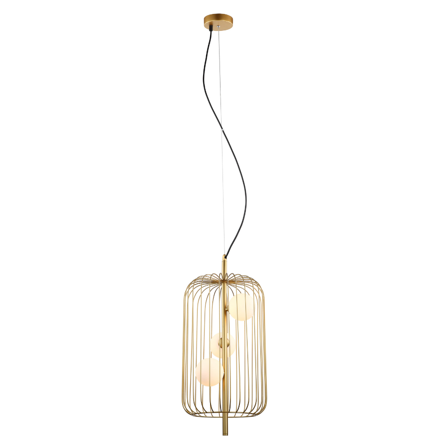 HAYDEN MDM-3934/3 GD to lampa wisząca z trzema źródłami światła. Zawiesie lampy wykonano z wysokiej jakości stali w kolorze złotym. Lampa posiada duży złoty druciany klosz wewnątrz którego osadzono trzy kuliste klosze z białego szkła. Oprawa będzie idealnym wyborem do wnętrz urządzonych w stylu nowoczesnym, industrialnym oraz loftowym. Doskonale będzie się prezentować w: salonie, jadalni, sypialni, pokoju młodzieżowym, gabinecie, lokalu, przedpokoju, kuchni. Dużym atutem jest możliwość regulacji wysokości. Wysokość maksymalna lampy to: 136 cm, średnica 31 cm. Źródłem światła jest żarówka typu G9 o mocy max 25W w ilości 3 szt.