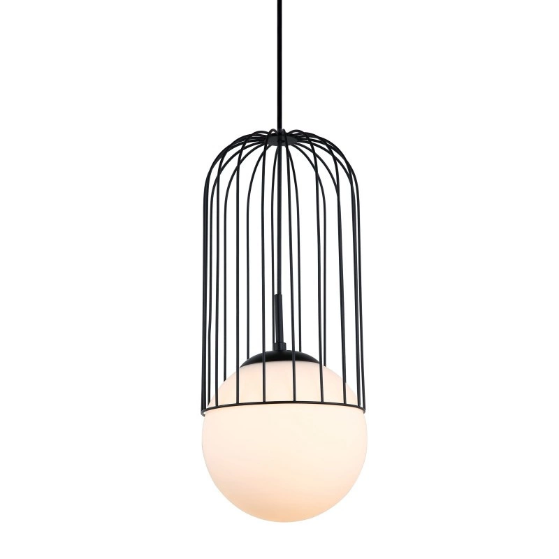 MATTY MDM-3940/1 BK to lampa wisząca z jednym źródłem światła. Zawiesie lampy wykonano z wysokiej jakości stali w kolorze czarnym. Lampa posiada podwójny klosz składający się z białej szklanej kuli ozdobionej czarnym kloszem z drutu. Oprawa będzie idealnym wyborem do wnętrz urządzonych w stylu nowoczesnym, industrialnym oraz loftowym. Doskonale będzie się prezentować w: salonie, jadalni, sypialni, pokoju młodzieżowym, gabinecie, lokalu, przedpokoju, kuchni. Dużym atutem jest możliwość regulacji wysokości. Wysokość maksymalna lampy to: 95,5 cm, średnica 20 cm. Źródłem światła jest żarówka typu E27 o mocy max 40W w ilości 1 szt.