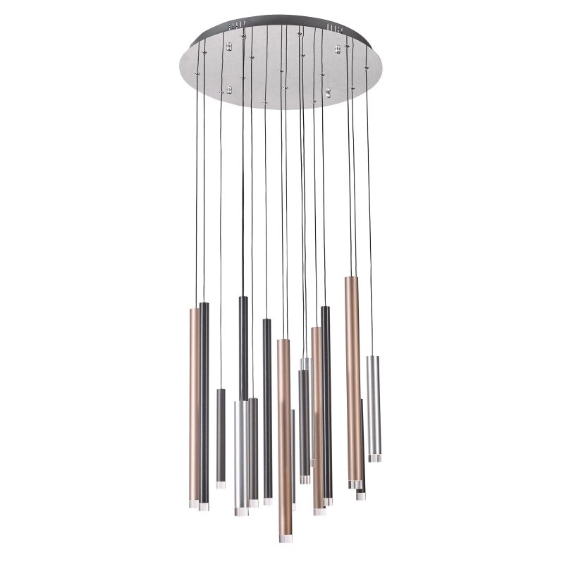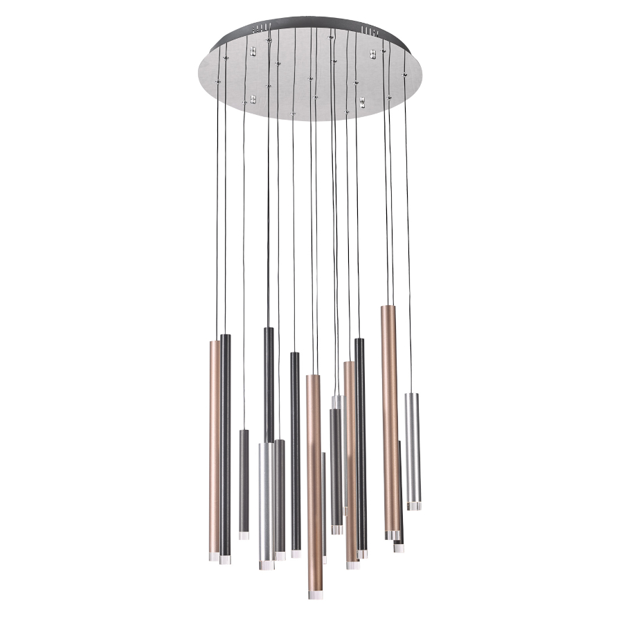 REYNA MD17077-16A to lampa wisząca z szesnastoma źródłami światła. Wykonana została z wysokiej jakości stali oraz aluminium. Lampa składa się z chromowej okrągłej podsufitki, z której zwisają walcowate klosze w kolorze chromowym, miedzianym oraz czarnym. Oprawa będzie idealnym wyborem do wnętrz urządzonych w nowoczesnym stylu. Doskonale będzie się prezentować w: salonie, jadalni, sypialni, pokoju młodzieżowym, gabinecie, lokalu, kuchni. Dużą zaletą jest możliwość regulacji wysokości. Wysokość maksymalna lampy to 150 cm, szerokość 55 cm, długość 55 cm. W lampie zastosowano zintegrowane źródła światła LED o łącznej mocy 64W, ciepłej barwie 3000K i jasności 4598lm
