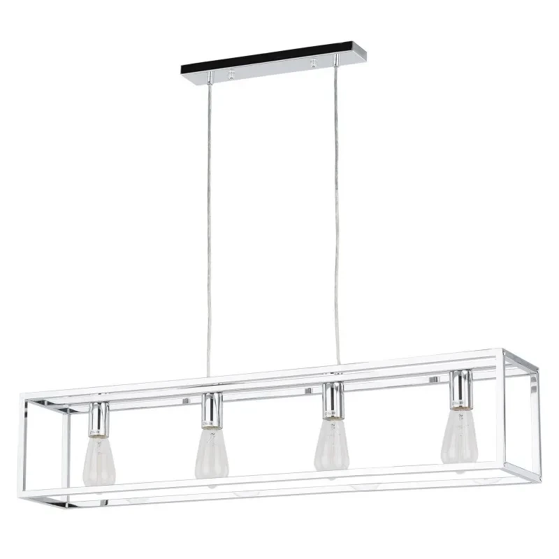 SIGALO MD-BR4366-D4 CH to lampa wisząca z czterema źródłami światła. Wykonana została z wysokiej jakości metalu w kolorze chromowym. Klosz lampy stanowi klatka wewnątrz której znajdują się cztery oprawki na żarówkę. Kształt klosza sprawia że odsłonięte żarówki są elementami ozdobnymi dlatego warto wybrać ich dekoracyjny model. Oprawa będzie idealnym wyborem do wnętrz urządzonych w stylu nowoczesnym, industrialnym oraz loftowym. Doskonale będzie się prezentować w: salonie, jadalni, sypialni, pokoju młodzieżowym, gabinecie, lokalu, kuchni. Dużym atutem jest możliwość regulacji wysokości. Wysokość maksymalna lampy to 140 cm, szerokość 18 cm, długość 98 cm. Źródłem światła jest żarówka typu E27 o mocy max 60W w ilości 4 szt.