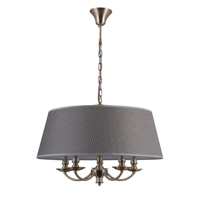 ZANOBI PND-43272-5A to lampa wisząca z pięcioma źródłami światła. Korpus lampy wykonano z wysokiej jakości stali w kolorze antycznego brązu ze szklanymi wstawkami. Abażur jest z szarej tkaniny z wytłaczanym wzorem. Oprawa będzie idealnym wyborem do wnętrz urządzonych w stylu klasycznym, industrialnym oraz loftowym. Doskonale będzie się prezentować w: salonie, jadalni, sypialni, pokoju młodzieżowym, gabinecie, lokalu, kuchni. Dużą zaletą jest możliwość regulacji wysokości. Wysokość maksymalna lampy to 89 cm, szerokość 60 cm, długość 60 cm. Źródłem światła jest żarówka typu E14 o mocy max 40W w ilości 5 szt.