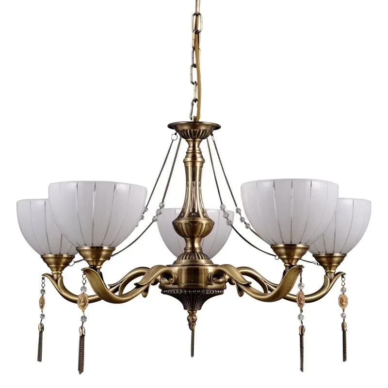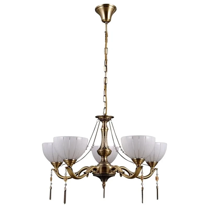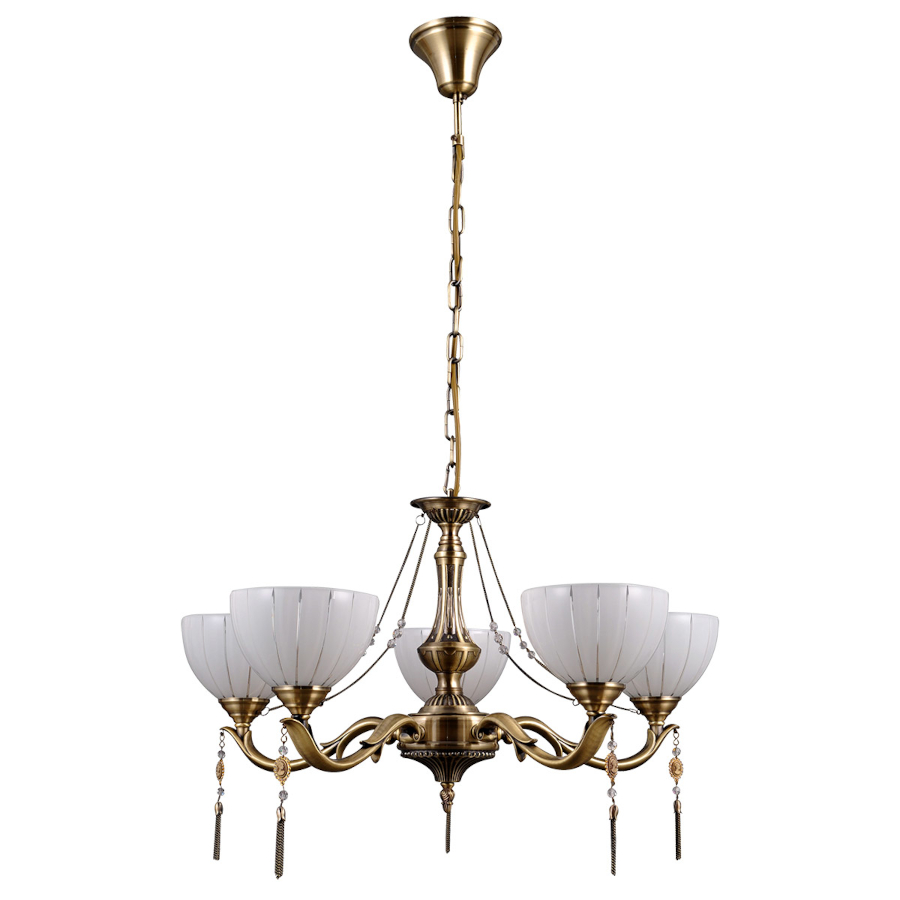 BAXIO MD38445-5 to lampa wisząca z pięcioma źródłami światła. Korpus lampy wykonano z wysokiej jakości metalu w kolorze złotym. Klosze są z mlecznego szkła. Żyrandol będzie idealnym wyborem do wnętrz urządzonych w klasycznym stylu. Doskonale będzie się prezentować w: salonie, jadalni, sypialni, pokoju młodzieżowym, gabinecie, lokalu, przedpokoju, kuchni. Dużą zaletą jest możliwość regulacji wysokości. Wysokość maksymalna lampy to: 81 cm, średnica 61 cm. Źródłem światła jest żarówka typu E27 o mocy max 60W w ilości 5 szt.