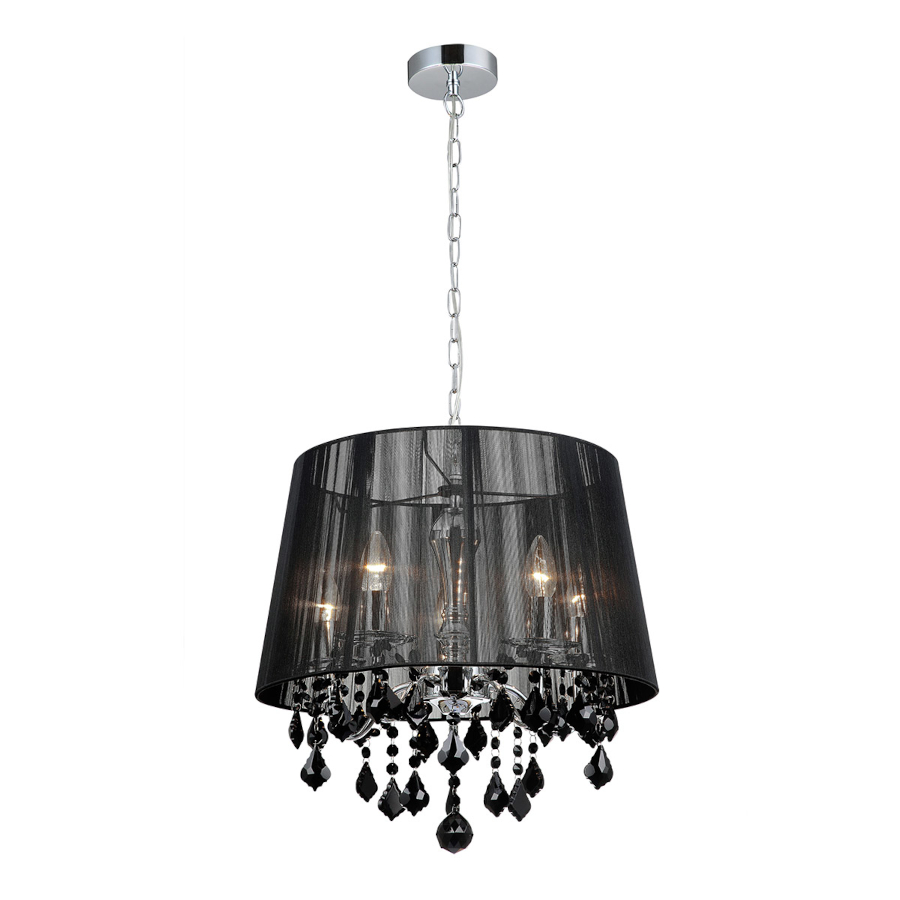 CORNELIA MDM-2572/5 BK to lampa wisząca z pięcioma źródłami światła. Zawiesie lampy wykonano z wysokiej jakości metalu w kolorze chromowym. Abażur jest z czarnej prześwitującej tkaniny. Dodatkowo lampa ozdobiona jest zwisającymi kryształkami. Oprawa będzie idealnym wyborem do wnętrz urządzonych w stylu nowoczesnym oraz minimalistycznym. Doskonale będzie się prezentować w: salonie, jadalni, sypialni, pokoju młodzieżowym, gabinecie, lokalu, biurze, kuchni. Dużym atutem jest możliwość regulacji wysokości. Wysokość maksymalna lampy to: 110 cm, średnica 45 cm. Źródłem światła jest żarówka typu E14 o mocy max 40W w ilości 5 szt.