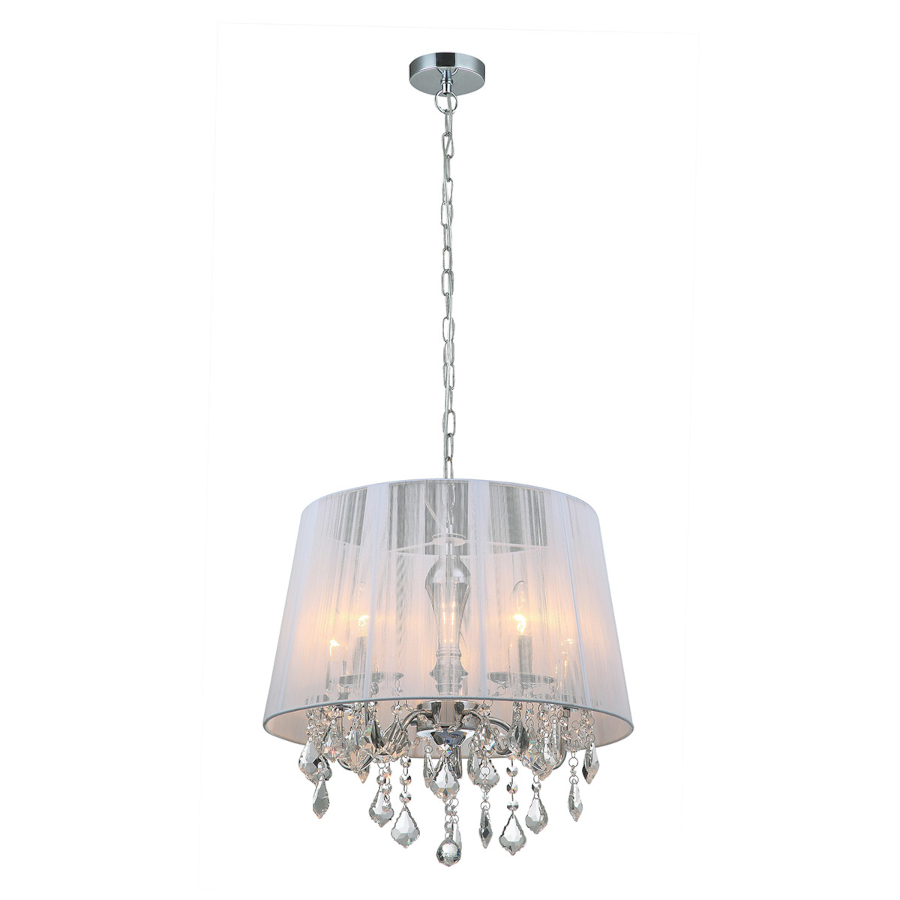 CORNELIA MDM-2572/5 W to lampa wisząca z pięcioma źródłami światła. Zawiesie lampy wykonano z wysokiej jakości metalu w kolorze chromowym. Abażur jest z białej prześwitującej tkaniny. Dodatkowo lampa ozdobiona jest zwisającymi kryształkami. Oprawa będzie idealnym wyborem do wnętrz urządzonych w stylu nowoczesnym oraz minimalistycznym. Doskonale będzie się prezentować w: salonie, jadalni, sypialni, pokoju młodzieżowym, gabinecie, lokalu, biurze, kuchni. Dużym atutem jest możliwość regulacji wysokości. Wysokość maksymalna lampy to: 110 cm, średnica 45 cm. Źródłem światła jest żarówka typu E14 o mocy max 40W w ilości 5 szt.