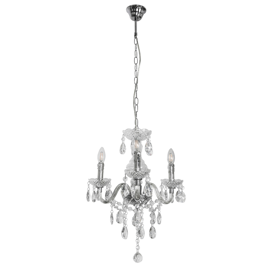 WHIZ L.90690/3CLE to lampa wisząca z trzema źródłami światła. Wykonana została z wysokiej jakości metalu w kolorze chromowym z ozdobnymi transparentnymi szkiełkami i brelokami. Lampa nie posiada kloszy co sprawa że odsłonięte żarówki są elementami ozdobnymi dlatego warto wybrać ich dekoracyjny model (najkorzystniej prezentuje się z żarówkami w kształcie świeczki). Żyrandol będzie idealnym wyborem do wnętrz urządzonych w klasycznym stylu. Doskonale będzie się prezentować w: salonie, jadalni, sypialni, pokoju młodzieżowym, gabinecie, lokalu, kuchni. Dużą zaletą jest możliwość regulacji wysokości. Wysokość maksymalna lampy to 113 cm, szerokość 48 cm, długość 48 cm. Źródłem światła jest żarówka typu E14 o mocy max 40W w ilości 3 szt.