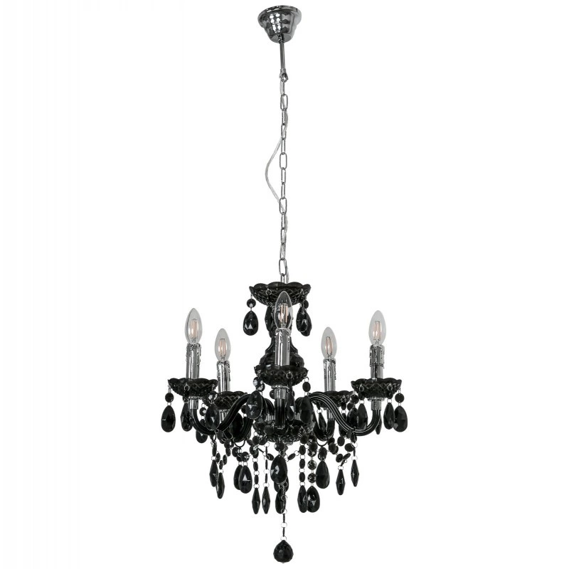 WHIZ L.90690/5BL to lampa wisząca z pięcioma źródłami światła. Wykonana została z wysokiej jakości metalu w kolorze czarnym z chromowymi detalami i ozdobnymi czarnymi szkiełkami oraz brelokami. Lampa nie posiada kloszy co sprawa że odsłonięte żarówki są elementami ozdobnymi dlatego warto wybrać ich dekoracyjny model (najkorzystniej prezentuje się z żarówkami w kształcie świeczki). Żyrandol będzie idealnym wyborem do wnętrz urządzonych w klasycznym stylu. Doskonale będzie się prezentować w: salonie, jadalni, sypialni, pokoju młodzieżowym, gabinecie, lokalu, kuchni. Dużą zaletą jest możliwość regulacji wysokości. Wysokość maksymalna lampy to 113 cm, szerokość 48 cm, długość 48 cm. Źródłem światła jest żarówka typu E14 o mocy max 40W w ilości 5 szt.