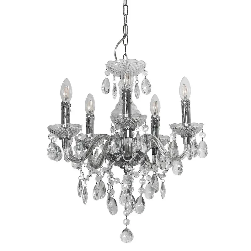 WHIZ L.90690/5CLE to lampa wisząca z pięcioma źródłami światła. Wykonana została z wysokiej jakości metalu w kolorze chromowym z ozdobnymi transparentnymi szkiełkami i brelokami. Lampa nie posiada kloszy co sprawa że odsłonięte żarówki są elementami ozdobnymi dlatego warto wybrać ich dekoracyjny model (najkorzystniej prezentuje się z żarówkami w kształcie świeczki). Żyrandol będzie idealnym wyborem do wnętrz urządzonych w klasycznym stylu. Doskonale będzie się prezentować w: salonie, jadalni, sypialni, pokoju młodzieżowym, gabinecie, lokalu, kuchni. Dużą zaletą jest możliwość regulacji wysokości. Wysokość maksymalna lampy to 113 cm, szerokość 48 cm, długość 48 cm. Źródłem światła jest żarówka typu E14 o mocy max 40W w ilości 5 szt.