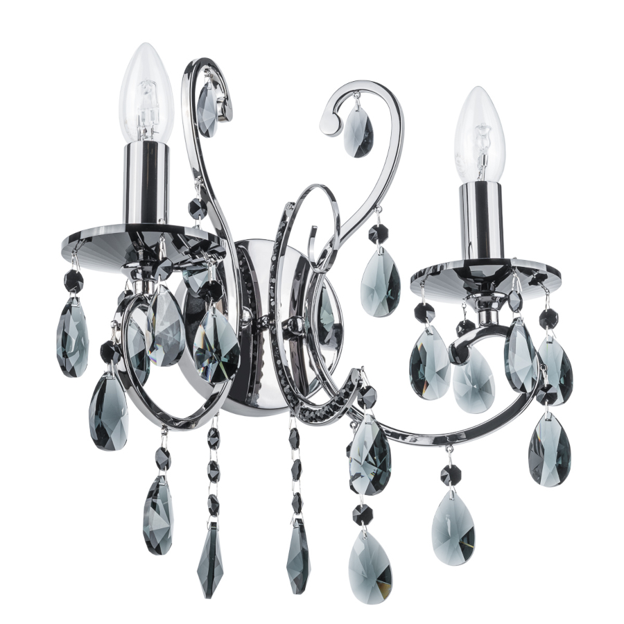 BAROCCO BLACK MB72709-2BCH to lampa ścienna z dwoma źródłami światła. Korpus lampy wykonano z wysokiej jakości metalu w kolorze chromowym z licznymi zdobieniami z czarnych kryształków. Lampa nie posiada kloszy sprawia że odsłonięte żarówki mogą być elementami ozdobnymi dlatego warto wybrać ich dekoracyjny model (najkorzystniej prezentuje się z żarówkami w kształcie świeczki). Kinkiet będzie idealnym wyborem do wnętrz urządzonych w stylu klasycznym, nowoczesnym oraz glamour. Doskonale będzie się prezentować w: salonie, jadalni, sypialni, pokoju młodzieżowym, gabinecie, lokalu, biurze, przedpokoju, korytarzu. Wysokość lampy to: 18 cm, szerokość 26 cm, długość 32 cm. Źródłem światła jest żarówka typu E14 o mocy max 40W w ilości 2 szt.