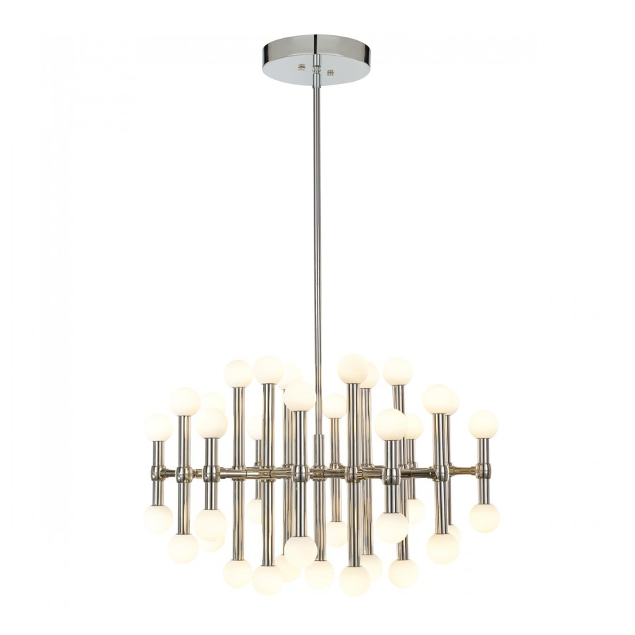GIOVANNA MX16009008-37A to lampa wisząca z trzydziestoma siedmioma źródłami światła. Wykonana została z wysokiej jakości stali i aluminium w kolorze satynowanego niklu. Klosze są z białego szkła. Oprawa będzie idealnym wyborem do wnętrz urządzonych w stylu nowoczesnym, industrialnym oraz loftowym. Doskonale będzie się prezentować w: salonie, jadalni, sypialni, pokoju młodzieżowym, gabinecie, lokalu, kuchni. Dużą zaletą jest możliwość regulacji wysokości. Wysokość maksymalna lampy to 150 cm, szerokość 70 cm, długość 70 cm. W lampie zastosowano zintegrowane źródła światła LED o łącznej mocy 94,2W, ciepłej barwie 3000K i jasności 6084lm
