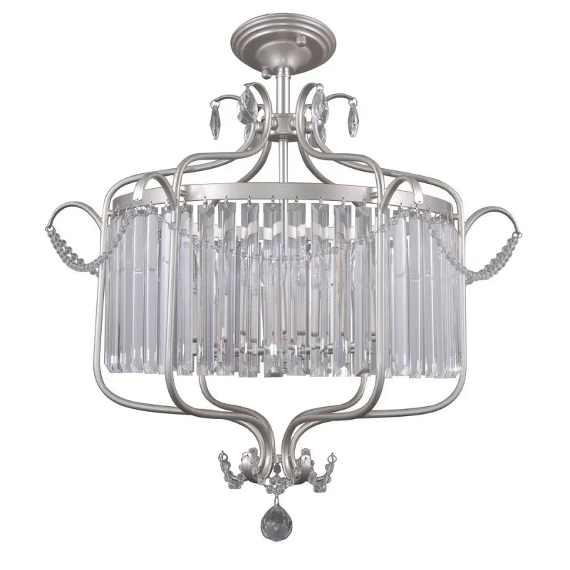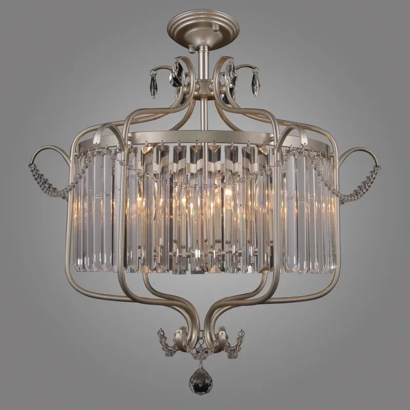 RINALDO PND-33057-6B-CH.S to lampa sufitowa z sześcioma źródłami światła. Korpus lampy wykonano z wysokiej jakości stali w kolorze srebrnym szampańskim. Klosz jest z transparentnych kryształów osadzonych na finezyjnie wygiętym stelażu. Oprawa będzie idealnym wyborem do wnętrz urządzonych w stylu klasycznym oraz glamour. Doskonale będzie się prezentować w: salonie, jadalni, sypialni, pokoju młodzieżowym, lokalu, kuchni. Wysokość lampy to: 60 cm, szerokość 66 cm, długość 66 cm. Źródłem światła jest żarówka typu E14 o mocy max 40W w ilości 6 szt.