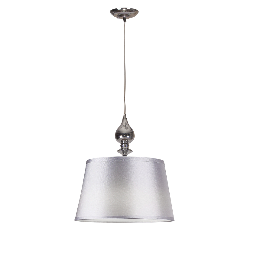 PRIMA 31-03690 to stylowa lampa wisząca z jednym źródłem światła. Zawiesie lampy wykonano z wysokiej jakości stali w kolorze chromowym, abażur jest srebrny nitkowy (od wewnątrz wzmocniony PCV). Oprawa będzie idealnym wyborem do wnętrz urządzonych w stylu klasycznym oraz nowoczesnym. Doskonale będzie się prezentować w salonie, jadalni, sypialni, pokoju, młodzieżowym, gabinecie, lokalu, kuchni. Dużym atutem jest możliwość regulacji wysokości. Wysokość maksymalna lampy to: 120 cm, średnica 35 cm. Źródłem światła jest żarówka typu E27 o mocy max 60W w ilości 1 szt.