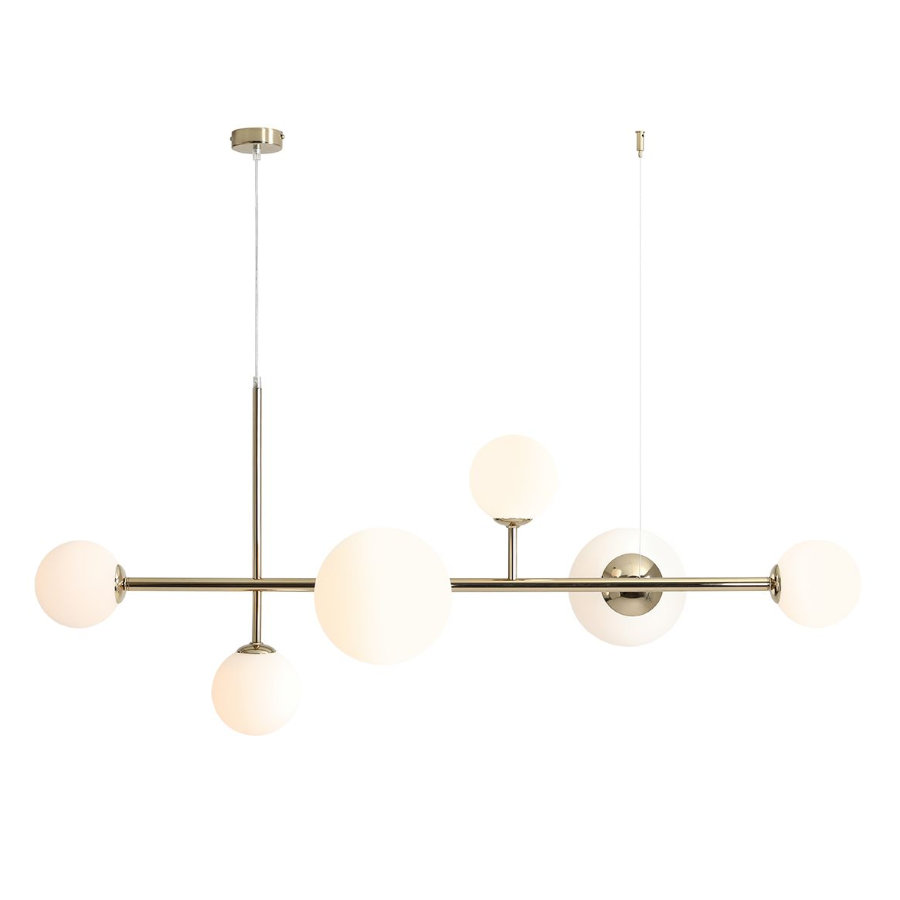 Idealnie sprawdzi się w każdym większym pomieszczeniu o oszczędnych i lekkich formach. Ten nowoczesny model firmy Aldex łączy w sobie estetykę wykończenia z ponadczasowym materiałem i kolorem. Mosiądz doda wnętrzu elegancji i odrobinę zmysłowości, a białe kuliste klosze spowodują, że nie przytłoczy nawet sypialnego pomieszczenia. Kule wykonane z matowego szkła rozmieszczone są wokół mosiądzowego ramienia lampy.