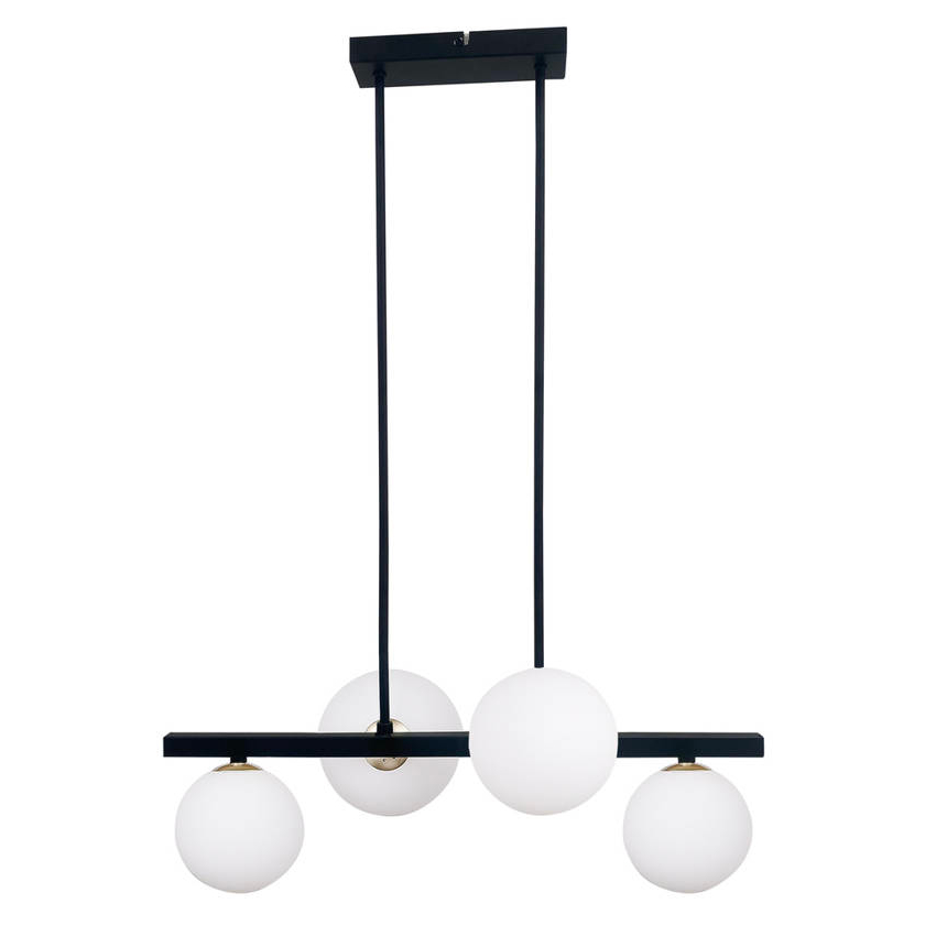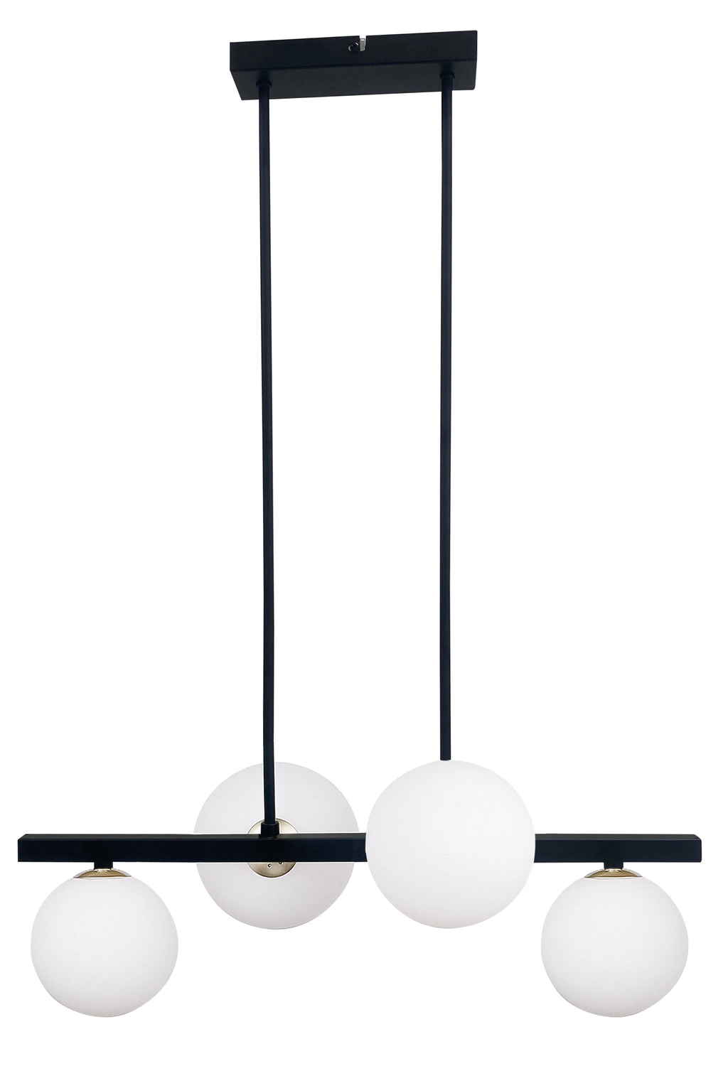 KAMA 34-01214 to stylowa lampa wisząca z czterema źródłami światła. Zawiesie lampy wykonano z wysokiej jakości metalu w kolorze czarnym ze złotymi detalami, klosze są z białego szkła. Oprawa będzie idealnym wyborem do wnętrz urządzonych w nowoczesnym stylu. Doskonale będzie się prezentować w salonie, jadalni, sypialni, pokoju, młodzieżowym, gabinecie, lokalu, kuchni. Wysokość lampy to: 83 cm, szerokość 59 cm, głębokość 35 cm. Źródłem światła jest żarówka typu G9 o mocy max 28W w ilości 4 szt.