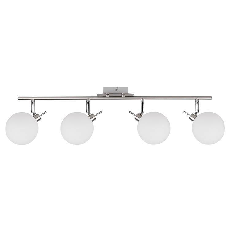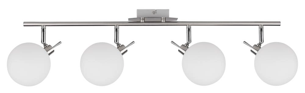 GHOST 94-01504 to stylowa lampa sufitowa z czterema źródłami światła. Korpus lampy wykonano z wysokiej jakości stali w kolorze satynowym, klosze są z białego szkła. Każdy z kloszy osadzony jest na ruchomym przegubie i ma możliwość regulacji położenia. Oprawa będzie idealnym wyborem do wnętrz urządzonych w stylu klasycznym oraz nowoczesnym. Doskonale będzie się prezentować w: salonie, jadalni, sypialni, pokoju młodzieżowym, gabinecie, lokalu, kuchni. Wysokość lampy to: 23 cm, szerokość 82 cm, głębokość 12 cm. Źródłem światła jest żarówka typu G9 o mocy max 40W w ilości 4 szt.