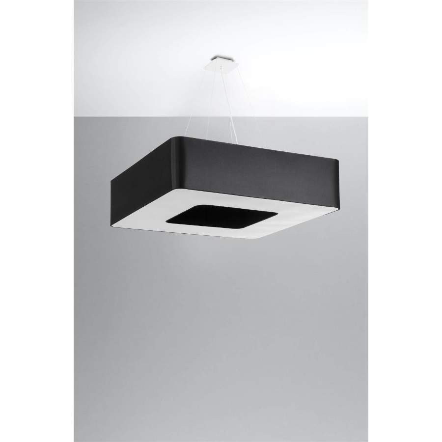 URANO SL.0828 to nowoczesna lampa wisząca z ośmioma źródłami światła. Wykonana została z wysokiej jakości tkaniny, stali oraz PVC. Lampa posiada czarny abażur w kształcie kwadratu z pustą przestrzenią w środku. Źródła światła osłonięte są białą membraną, która równomiernie rozprasza światło. Oprawa będzie idealnym wyborem do wnętrz urządzonych w nowoczesnym stylu. Doskonale będzie się prezentować w: salonie, jadalni, sypialni, pokoju młodzieżowym, gabinecie, biurze, lokalu, kuchni. Dużą zaletą jest możliwość regulacji wysokości. Wysokość maksymalna lampy to: 112 cm, szerokość 80 cm, głębokość 80 cm. Źródłem światła jest żarówka typu E27 o mocy max 60W w ilości 8 szt.