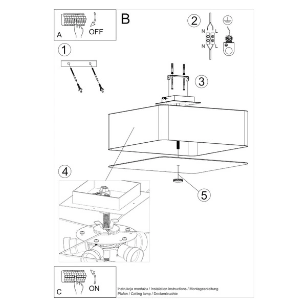 LOKKO SL.0826 to nowoczesna lampa sufitowa z pięcioma źródłami światła. Korpus lampy wykonano z wysokiej jakości stali. Abażur jest z czarnej tkaniny zamknięty od spodu mleczną taflą szkła. Oprawa będzie idealnym wyborem do wnętrz urządzonych w stylu nowoczesnym oraz minimalistycznym. Doskonale będzie się prezentować w: salonie, jadalni, sypialni, pokoju młodzieżowym, gabinecie, biurze, lokalu, kuchni. Wysokość lampy to: 25 cm, szerokość 55 cm, długość 55 cm. Źródłem światła jest żarówka typu E27 o mocy max 60W w ilości 5 szt.