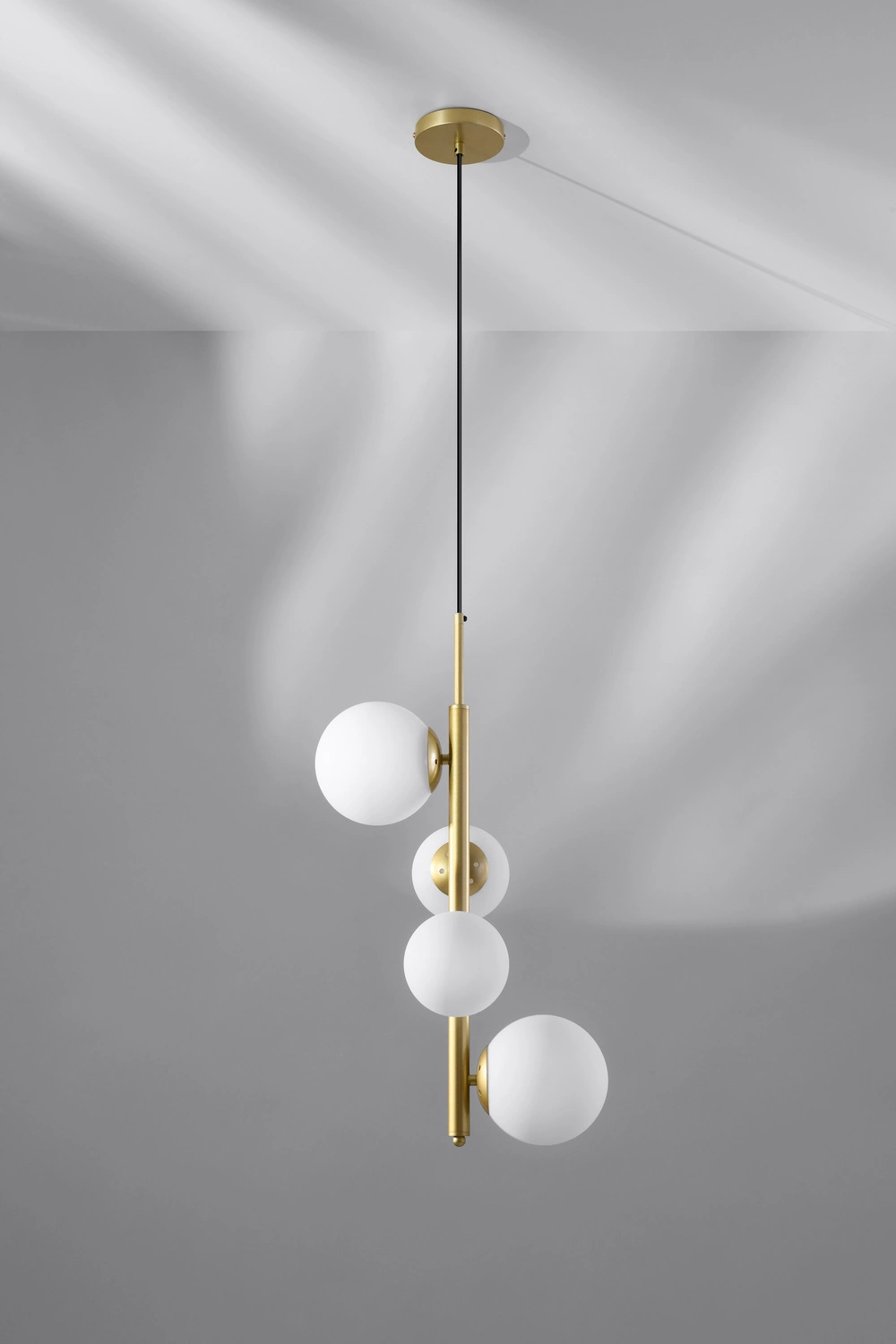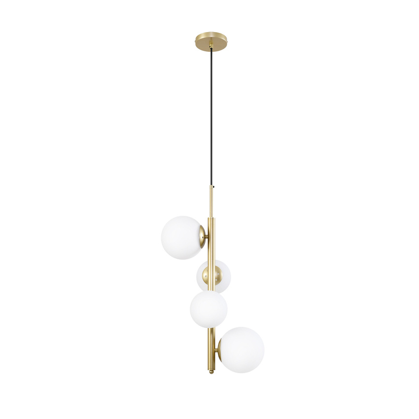 CORDEL 34-01559 to stylowa lampa wisząca z czterema źródłami światła. Zawiesie lampy wykonano z wysokiej jakości stali w kolorze mosiężnym, klosze są z białego szkła. Oprawa będzie idealnym wyborem do wnętrz urządzonych w stylu klasycznym oraz nowoczesnym. Doskonale będzie się prezentować w salonie, jadalni, sypialni, pokoju, młodzieżowym, gabinecie, lokalu, kuchni. Dużym atutem jest możliwość regulacji wysokości. Wysokość maksymalna lampy to: 120 cm, szerokość 32 cm, głębokość 28 cm. Źródłem światła jest żarówka typu G9 o mocy max 20W w ilości 4 szt.