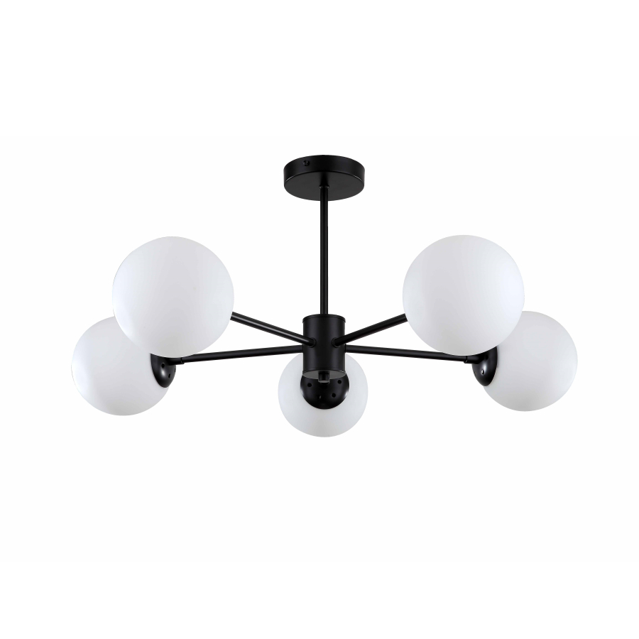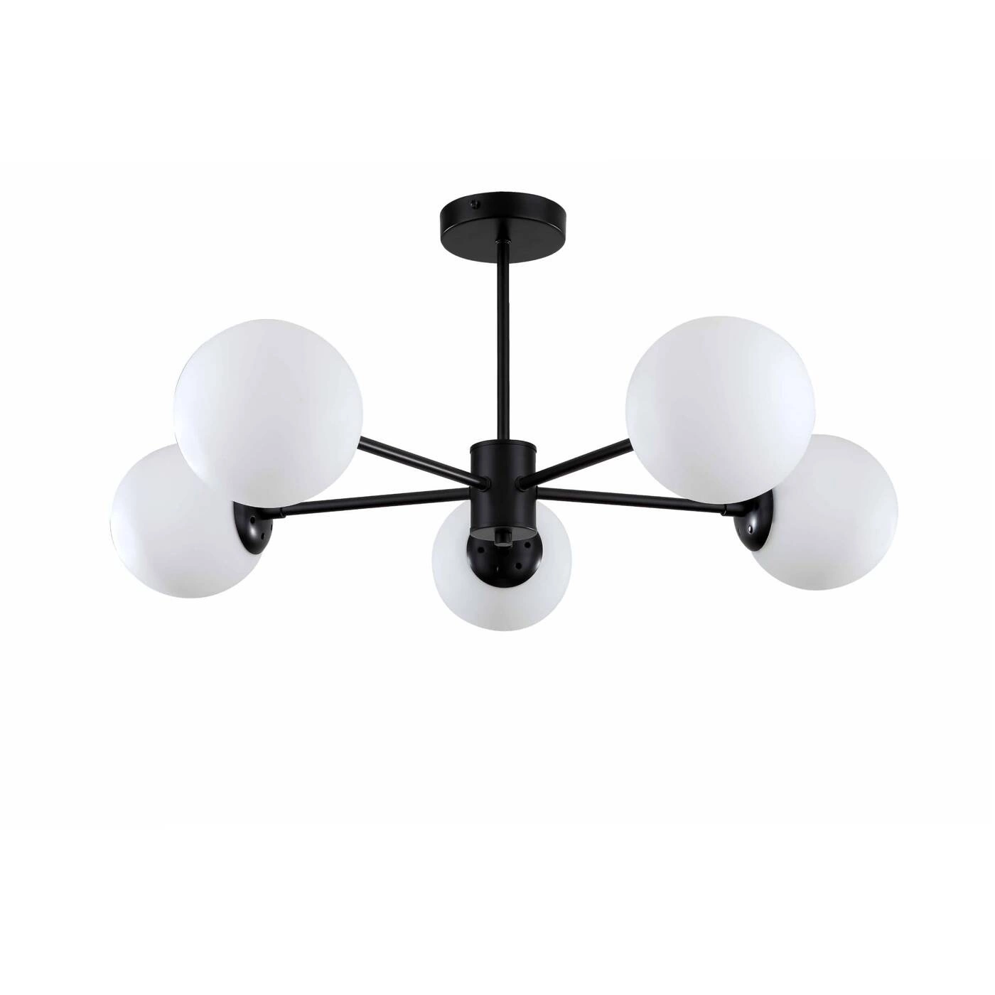 ROMA LP-1345/5P BK to stylowa lampa wisząca z pięcioma źródłami światła. Korpus lampy wykonano z wysokiej jakości metalu w kolorze czarnym. Klosze są z białego szkła. Oprawa będzie idealnym wyborem do wnętrz urządzonych w stylu klasycznym oraz nowoczesnym. Doskonale będzie się prezentować w: salonie, jadalni, sypialni, pokoju młodzieżowym, gabinecie, biurze, lokalu, kuchni. Wysokość lampy to: 30 cm, szerokość 78,5 cm, głębokość 78,5 cm. Źródłem światła jest żarówka typu E14 o mocy max 40W w ilości 5 szt.