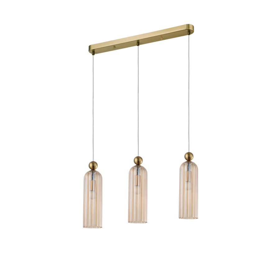 PIEGA LP-939/3L amber to stylowa lampa wisząca z trzema źródłami światła. Zawiesie lampy wykonano z wysokiej jakości metalu w kolorze złotym. Klosze są z bursztynowego szkła z pionowym wzorem. Oprawa będzie idealnym wyborem do wnętrz urządzonych w stylu klasycznym oraz nowoczesnym. Doskonale będzie się prezentować w: salonie, jadalni, sypialni, pokoju młodzieżowym, gabinecie, biurze, lokalu, kuchni. Dużą zaletą jest możliwość regulacji wysokości. Wysokość maksymalna lampy to: 150 cm, szerokość 55 cm, głębokość 10 cm. Źródłem światła jest żarówka typu E14 o mocy max 40W w ilości 3 szt.