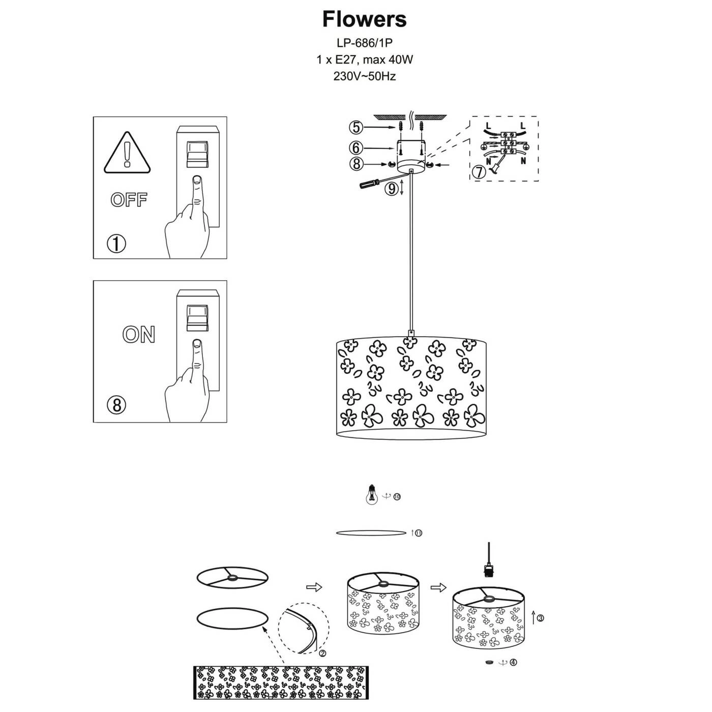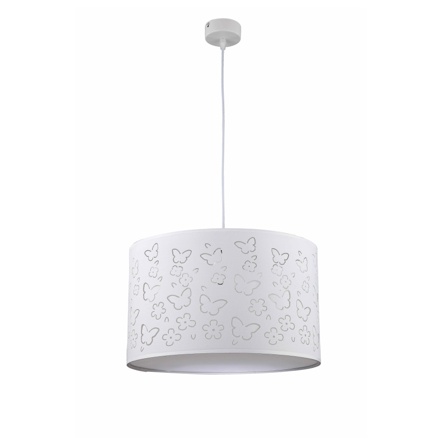 FLOWERS LP-686/1P to stylowa lampa wisząca z jednym źródłem światła, która idealnie wkomponuje się do dziecięcego pokoju. Zawiesie lampy wykonano z plastiku, abażur jest z białej tkaniny z motywem kwiatowym. Dużym atutem jest możliwość regulacji wysokości. Wysokość maksymalna lampy to: 150 cm, średnica 38 cm. Źródłem światła jest żarówka typu E27 o mocy max 40W w ilości 1 szt.