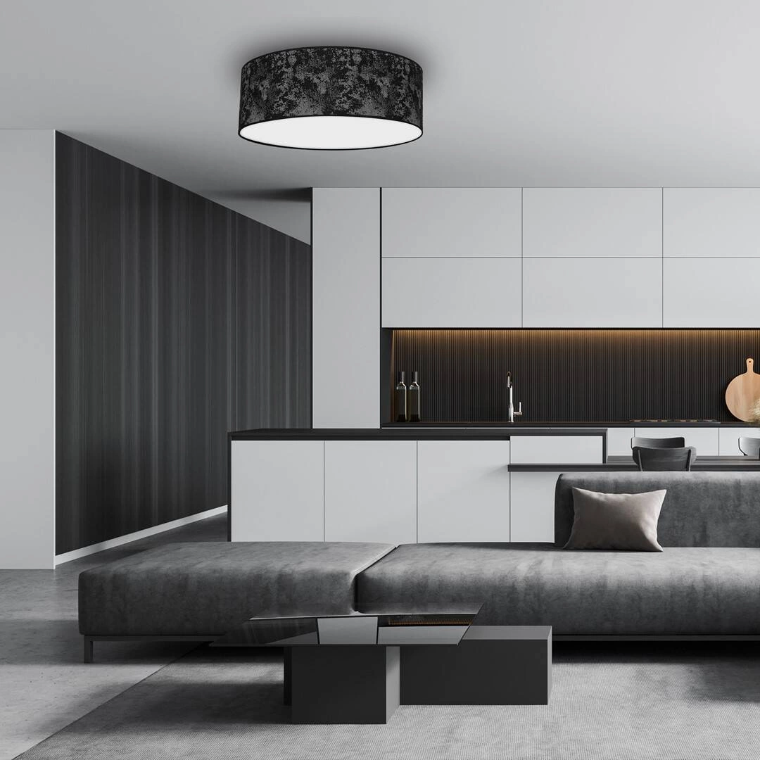 SATINO MLP7329 to stylowa lampa sufitowa z trzema źródłami światła. Korpus lampy wykonano z wysokiej jakości metalu. Abażur jest z czarno-srebrnej tkaniny, zamknięty od spodu mleczną osłoną z tworzywa. Oprawa będzie idealnym wyborem do wnętrz urządzonych w nowoczesnym stylu. Doskonale będzie się prezentować w: salonie, jadalni, sypialni, pokoju młodzieżowym, gabinecie, biurze, lokalu, przedpokoju, korytarzu, kuchni. Wysokość lampy to: 13 cm, średnica 50 cm. Źródłem światła jest żarówka typu E27 o mocy max 60W w ilości 3 szt.