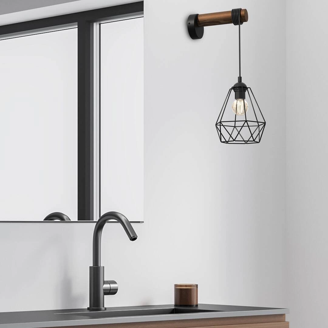 ACERO MLP7886 to stylowa lampa ścienna z jednym źródłem światła. Korpus lampy wykonano z wysokiej jakości metalu w kolorze czarnym i drewna. Klosz jest druciany. Kształt klosza sprawia że odsłonięta żarówka jest elementem ozdobnym dlatego warto wybrać jej dekoracyjny model. Kinkiet będzie idealnym wyborem do wnętrz urządzonych w stylu industrialnym, loftowym oraz skandynawskim. Doskonale będzie się prezentować w: salonie, jadalni, sypialni, pokoju młodzieżowym, gabinecie, biurze, lokalu, przedpokoju, korytarzu. Dużym atutem jest możliwość regulacji wysokości. Wysokość maksymalna lampy to: 50 cm, szerokość 18 cm, głębokość 25 cm. Źródłem światła jest żarówka typu E27 o mocy max 60W w ilości 1 szt.