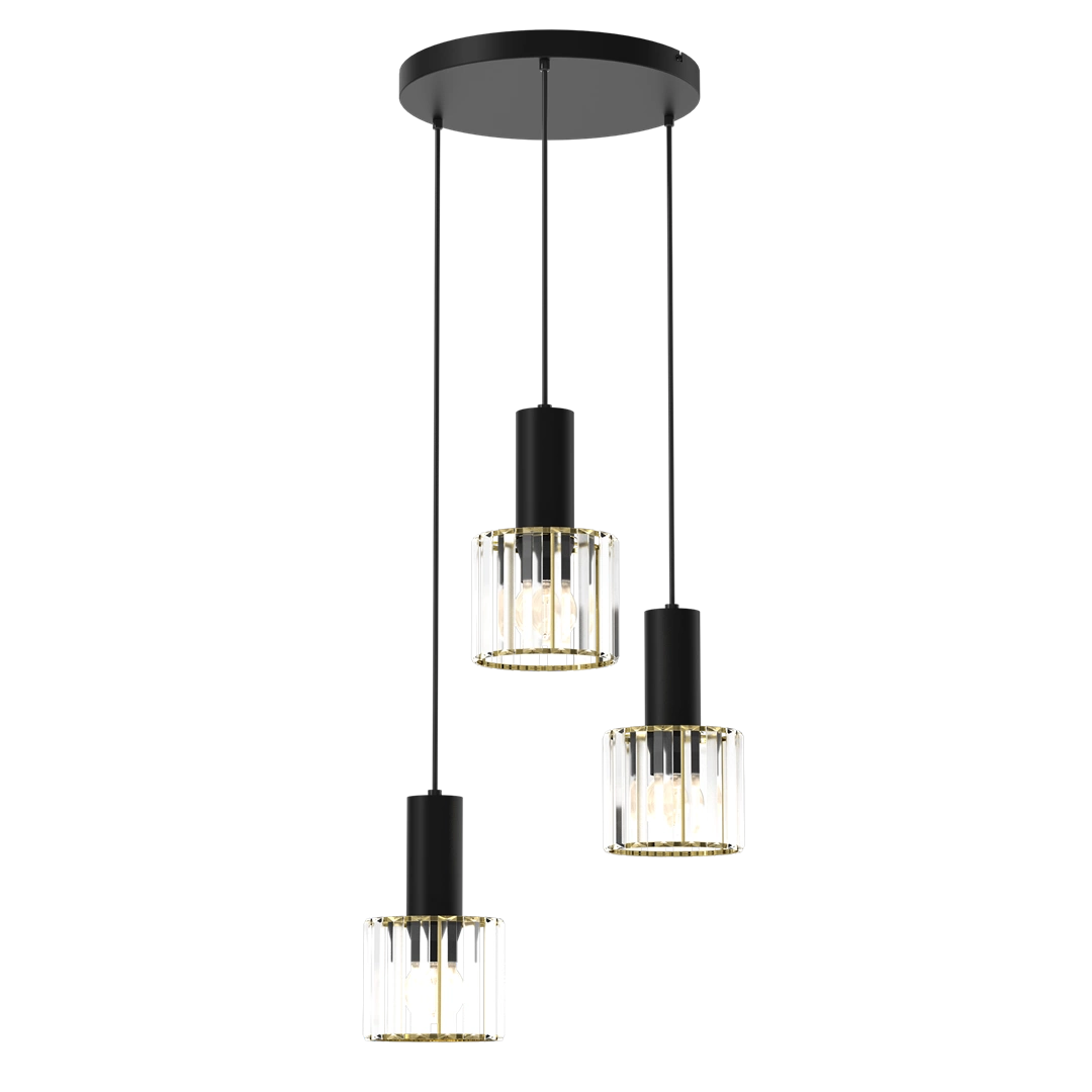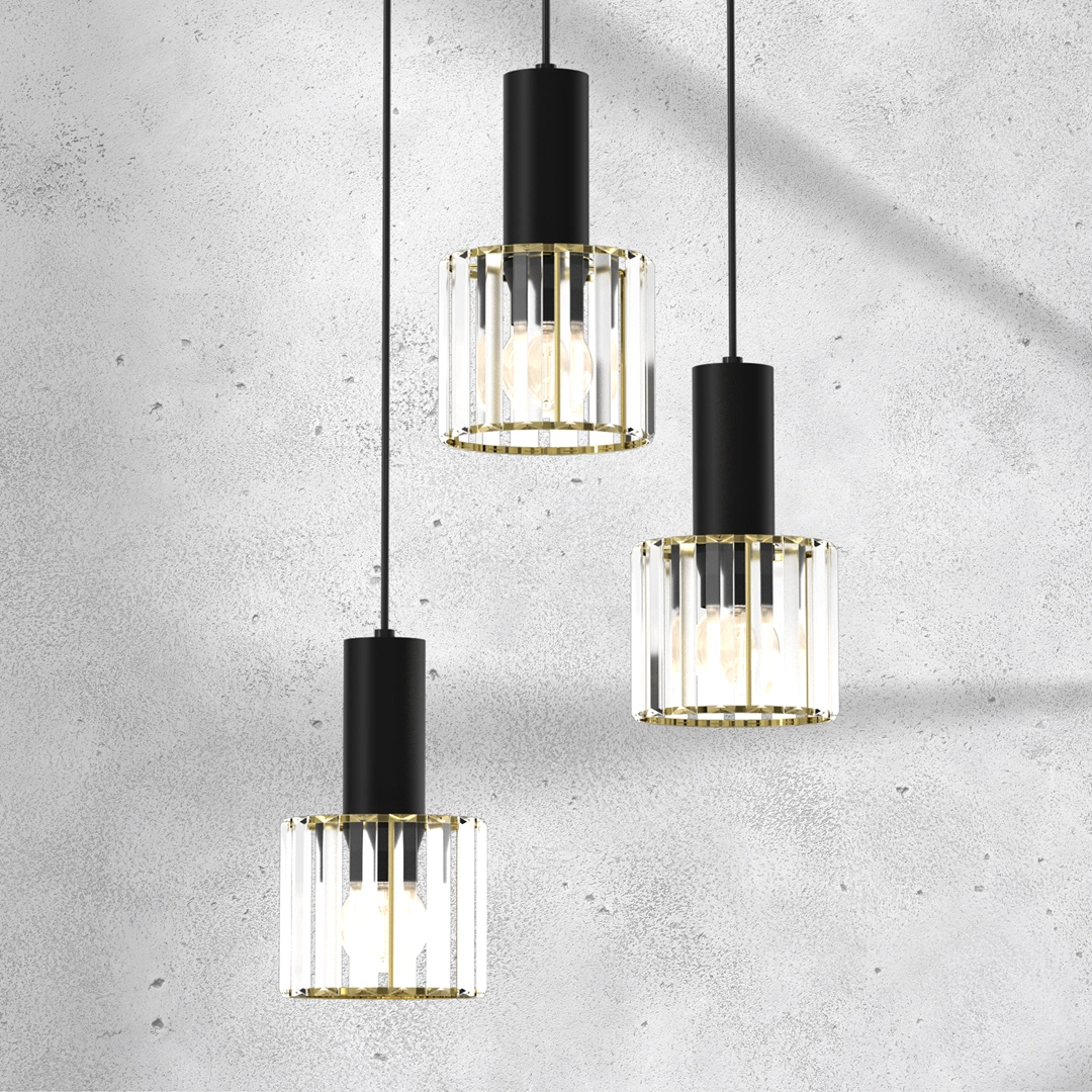CRISTAL MLP8362 to elegancka lampa wisząca z trzema źródłami światła. Zawiesie lampy wykonano z wysokiej jakości metalu i plastiku w kolorze czarnym. Klosze są z transparentnych kryształów ze złotym wykończeniem. Oprawa będzie idealnym wyborem do wnętrz urządzonych w klasycznym stylu. Doskonale będzie się prezentować w: salonie, jadalni, sypialni, pokoju młodzieżowym, gabinecie, biurze, lokalu, przedpokoju, kuchni. Dużym atutem jest możliwość regulacji wysokości. Wysokość maksymalna lampy to: 90 cm, szerokość 30 cm, głębokość 30 cm. Źródłem światła jest żarówka typu E27 o mocy max 60W w ilości 3 szt.