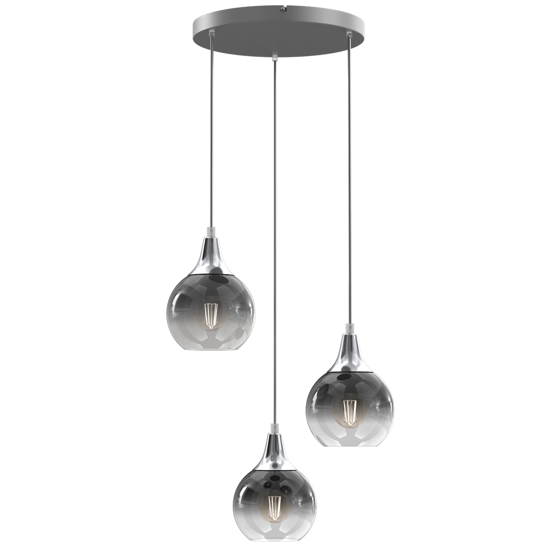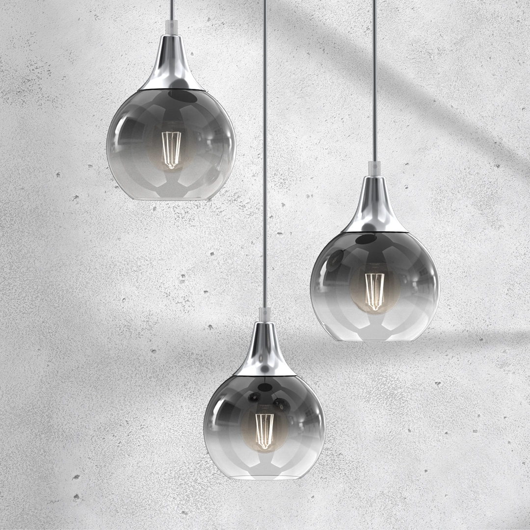 MONTE SILVER MLP8323 to stylowa lampa wisząca z trzema źródłami światła. Zawiesie lampy wykonano z wysokiej jakości metalu w kolorze srebrnym. Klosze są z transparentnego szkła barwionego srebrnym lakierem proszkowym. Oprawa będzie idealnym wyborem do wnętrz urządzonych w stylu klasycznym oraz nowoczesnym. Doskonale będzie się prezentować w: salonie, jadalni, sypialni, pokoju młodzieżowym, gabinecie, biurze, lokalu, przedpokoju, kuchni. Dużym atutem jest możliwość regulacji wysokości. Wysokość maksymalna lampy to: 90 cm, szerokość 22 cm, głębokość 22 cm. Źródłem światła jest żarówka typu E27 o mocy max 60W w ilości 3 szt.
