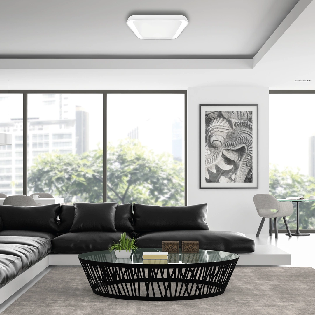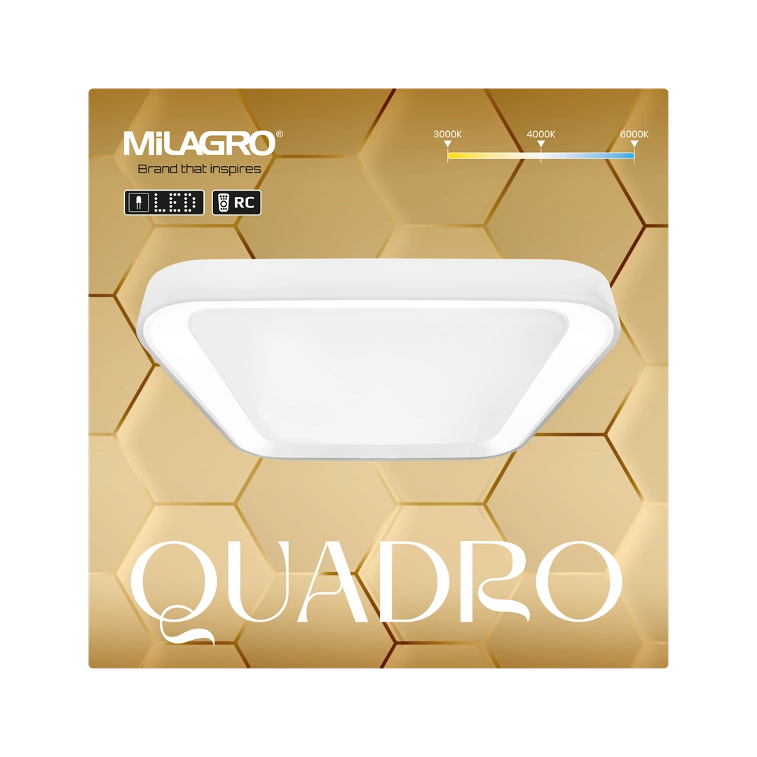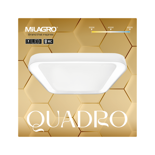 QUADRO ML7928 to nowoczesna lampa sufitowa, która doskonale będzie się prezentować w każdym pomieszczeniu. Wykonana została z metalu i tworzywa sztucznego w kolorze białym. Lampa wyposażona jest w pilot, który umożliwia między innymi ściemnianie, a także regulację barwy światła- od zimnej, przez neutralną aż po ciepłą. Wysokość lampy to: 7 cm, szerokość 40 cm, głębokość 40 cm. W lampie zastosowano wymienne źródło światła LED o mocy 38W i zmiennej barwie światła 3000K-6000K