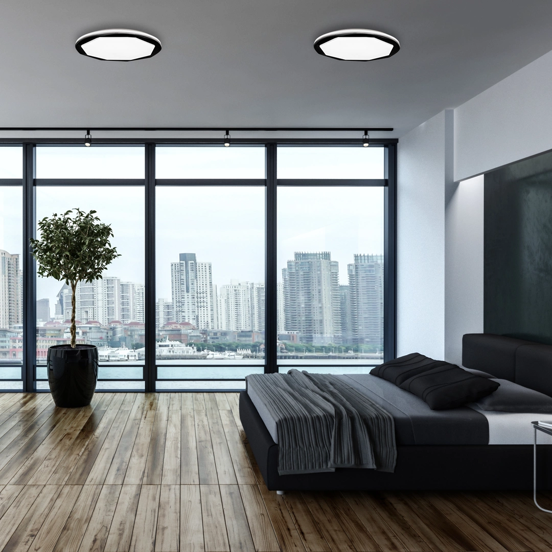 OPTIMA ML7053 to nowoczesna lampa sufitowa, która doskonale będzie się prezentować w każdym pomieszczeniu. Wykonana została z metalu i tworzywa sztucznego w kolorze białym z czarnymi detalami. Plafon ma okrągły kształt, a osłona źródła światła jest w kształcie wielościanu. Elementem wyróżniającym lampy są efektowne zdobienia na obudowie. Lampa wyposażona jest w pilot, który umożliwia między innymi ściemnianie, a także regulację barwy światła- od zimnej, przez neutralną aż po ciepłą. Wysokość lampy to: 6 cm, a średnica 48 cm. W lampie zastosowano źródło światła LED o mocy 52W, zmiennej barwie światła 3000K-6000K i jasności 3640lm.