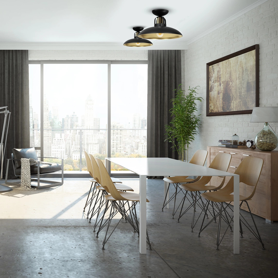 FELIX MLP8905 to stylowa lampa sufitowa z jednym źródłem światła. Wykonana została z wysokiej jakości metalu w kolorze czarnym, klosz od wewnątrz jest złoty. Kształt klosza sprawia, że odsłonięta żarówka jest elementem ozdobnym lampy dlatego warto wybrać jej dekoracyjny model. Oprawa będzie idealnym wyborem do wnętrz urządzonych w stylu nowoczesnym, industrialnym oraz loftowym. Doskonale będzie się prezentować w: salonie, jadalni, sypialni, pokoju młodzieżowym, gabinecie, biurze, lokalu, kuchni. Wysokość lampy to: 16 cm, szerokość 30 cm, głębokość 30 cm. Źródłem światła jest żarówka typu E27 o mocy max 60W w ilości 1 szt.