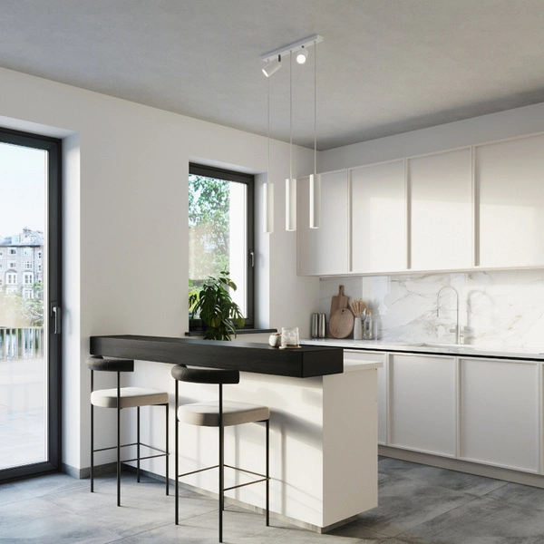 RING SL.1098 to stylowa lampa wisząca z pięcioma źródłami światła. Wykonana została z wysokiej jakości stali w kolorze białym. Oprawa będzie idealnym wyborem do wnętrz urządzonych w stylu klasycznym oraz nowoczesnym. Doskonale będzie się prezentować w: salonie, jadalni, sypialni, pokoju młodzieżowym, gabinecie, biurze, lokalu, przedpokoju, kuchni. Dużym atutem jest możliwość regulacji wysokości. Wysokość maksymalna lampy to: 100 cm, szerokość 5 cm, długość 45 cm. Reflektorki osadzone na podsufitce mają możliwość regulacji kierunku padania światła. Źródłem światła jest żarówka typu GU10 o mocy max 40W w ilości 5 szt.