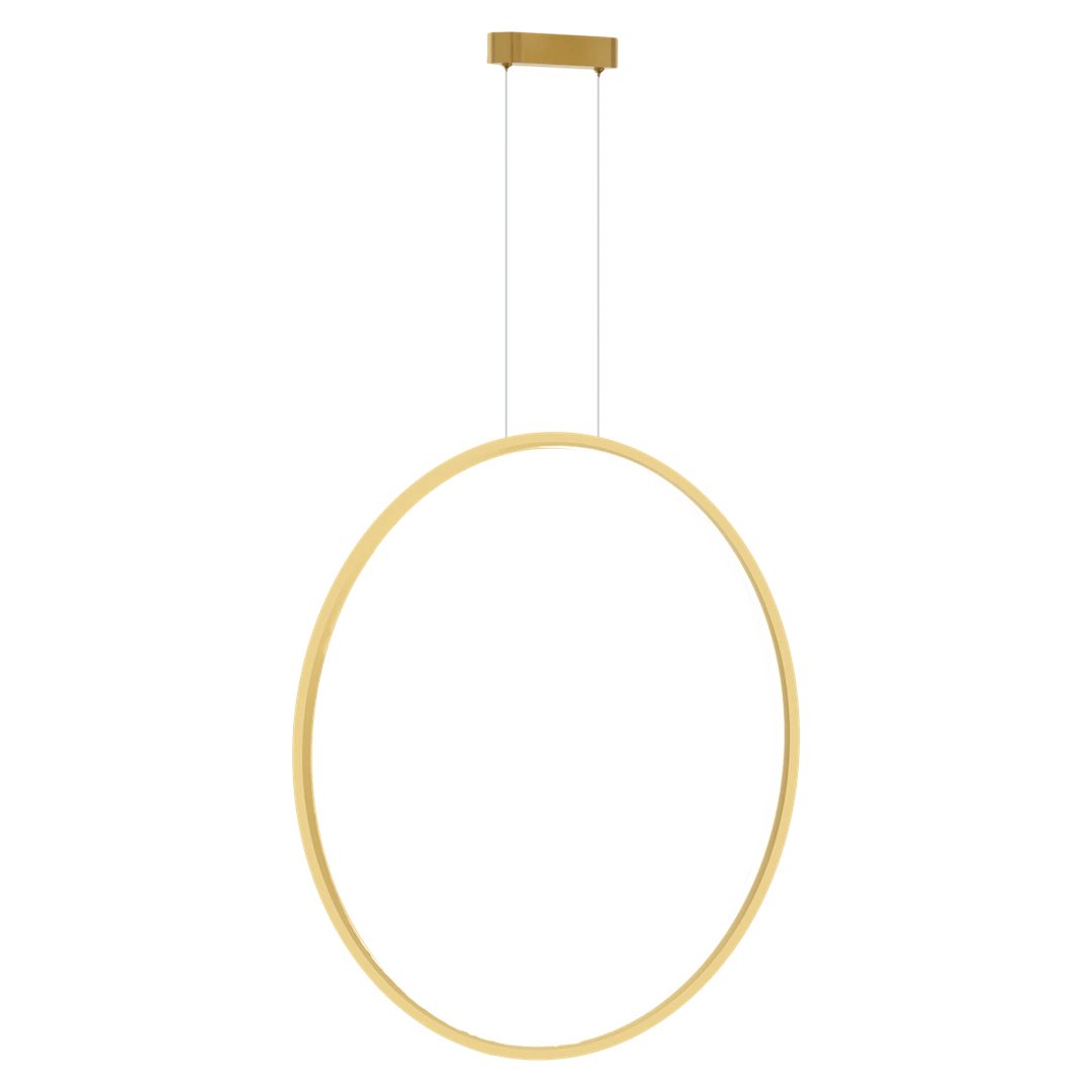 SATURNO ML8857 to stylowa lampa wisząca z jednym źródłem światła. Lampa składa się z aluminiowego złotego pierścienia zwisającego z podsufitki na stalowych linkach. Źródło światła znajduje się pod mlecznym paskiem z tworzywa. Oprawa będzie idealnym wyborem do wnętrz urządzonych w nowoczesnym stylu. Doskonale będzie się prezentować w: salonie, jadalni, sypialni, pokoju młodzieżowym, gabinecie, biurze, lokalu, przedpokoju, kuchni, łazience. Dużą zaletą jest możliwość regulacji wysokości. Wysokość maksymalna lampy to: 130 cm, szerokość 80 cm, głębokość 6 cm. Źródłem światła jest zintegrowany LED o mocy 46W, neutralnej barwie 4000K i jasności 2500lm.