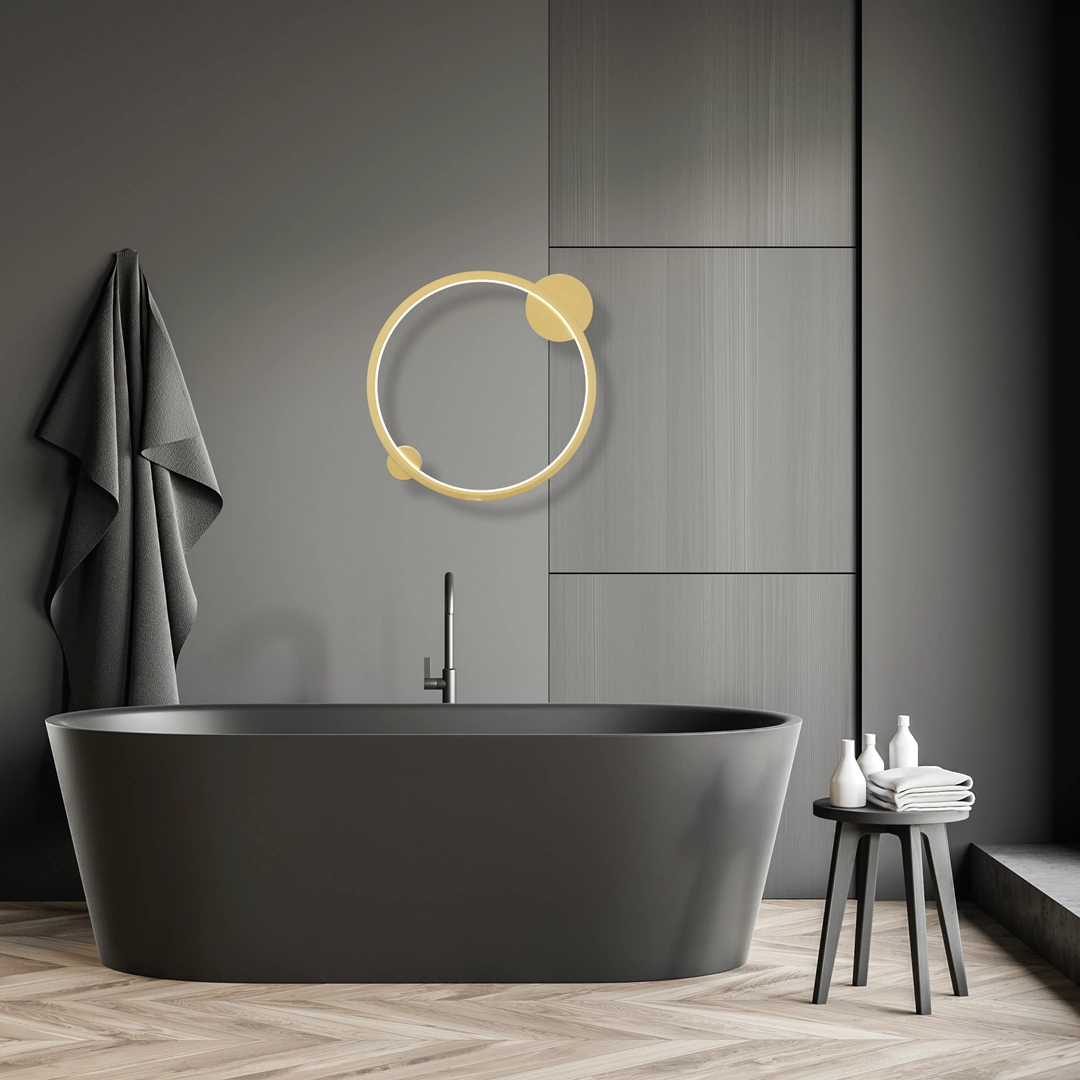 SATURNO ML8859 to stylowa lampa z jednym źródłem światła, która może być zamontowana zarówno na ścianie jak i na suficie. Lampa ma kształt pierścienia, wykonana została z aluminium w kolorze złotym, źródło światła znajduje się pod mlecznym paskiem z tworzywa. Oprawa będzie idealnym wyborem do wnętrz urządzonych w nowoczesnym stylu. Doskonale będzie się prezentować w: salonie, jadalni, sypialni, pokoju młodzieżowym, gabinecie, biurze, lokalu, przedpokoju, kuchni, łazience. Wysokość lampy to: 57 cm, szerokość 50 cm, głębokość 5,5 cm. Źródłem światła jest zintegrowany LED o mocy 25W, neutralnej barwie 4000K i jasności 1400lm